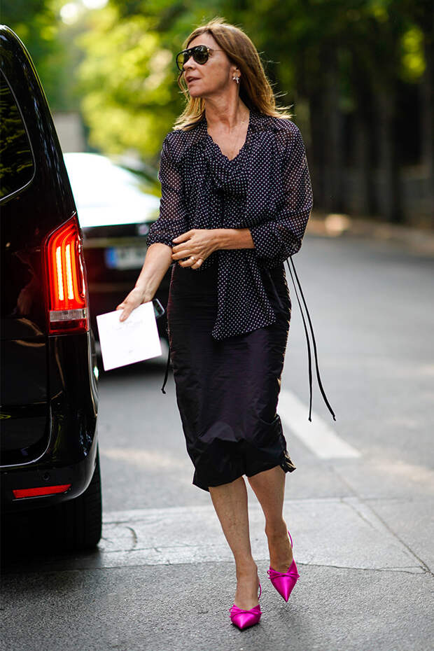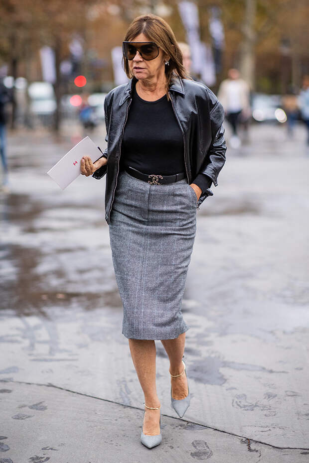 Главред CR Fashion Book и международный директор моды Harper’s Bazaar Карин Ройтфельд из года в год эксплуатирует одни и те же классические фасоны. Чаще всего в хрониках стритстайла ее можно увидеть в идеально сидящей юбке-карандаше, сорочке или шелковой блузке и непременно на высоких каблуках.