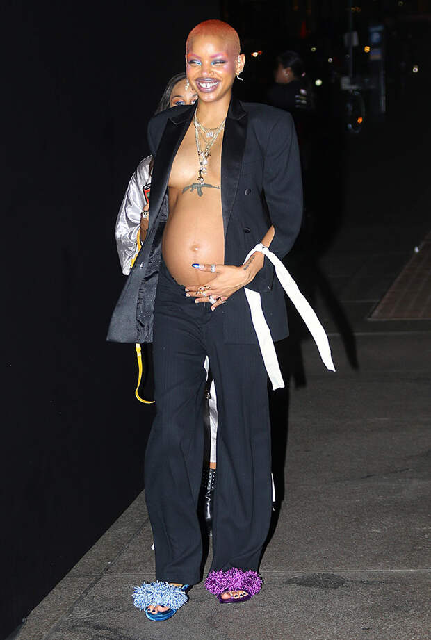 Так, сейчас она находится в Нью-Йорке и активно ходит по светским вечеринкам, демонстрируя фотографам и журналистам заметно округлившийся живот. Изменившимися формами звезда подиумов и подруга Рианны явно гордится: иначе нельзя объяснить, почему она носит столь откровенные наряды. Например, на церемонию вручения премии The Daily Front Row's бритоголовая афроамериканка пришла в прозрачном мини-платье с цветными перьями, а днем ранее появилась на одной из вечеринок в рамках Недели моды в брючном костюме на голое тело. На Вудс не было ни бюстгальтера, ни топа: из-под жакета виднелся лишь обнаженный торс.Слик можно официально присвоить звание самой необычной и смелой беременной: готовы поспорить, что таких будущих мам вы еще никогда не видели!