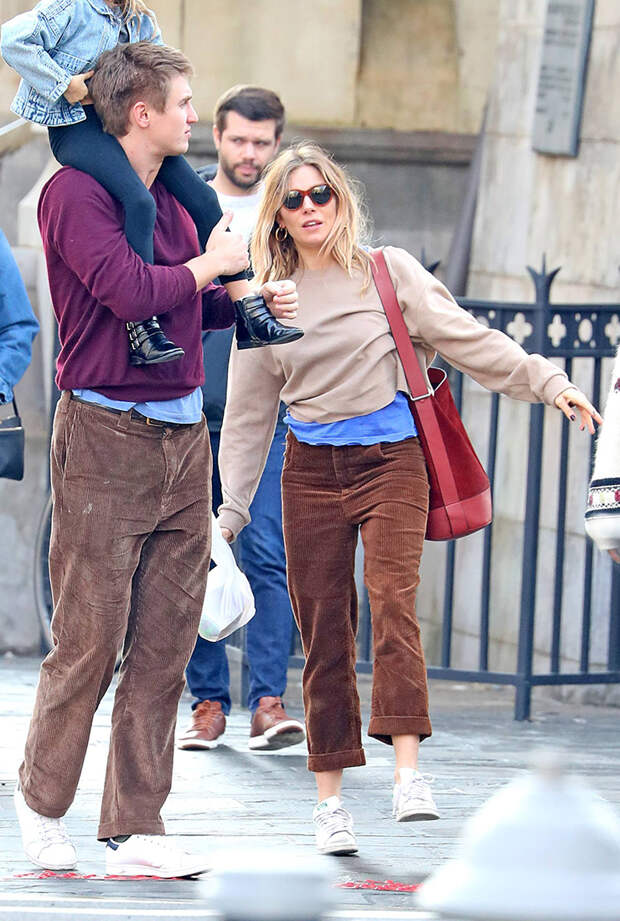 Например, 5 февраля папарацци застали парочку на прогулке по Нью-Йорку в почти одинаковых вельветовых брюках, уютных джемперах и белых кедах. Сиенна также дополнила образ беретом в французском стиле и алой кожаной сумкой-мешком.