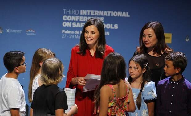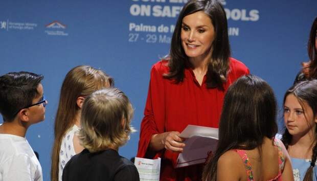 Королева Летиция прибыла на Пальму-де-Майорку, чтобы принять участие в конференции, посвященной школьному образованию. Выступив с речью, монаршая особа пообщалась с юными учениками местных учреждений. Не обошлось и без трогательных совместных фото. Для ответственного события супруга Филиппа VI выбрала алое летящее платье, которое дополнила лодочками и клатчем с самым популярным принтом сезона - змеиным.