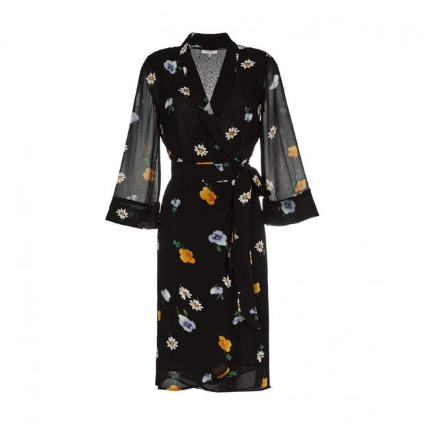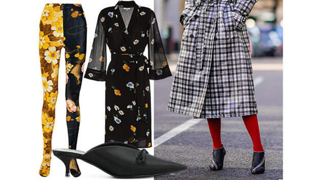 Платье не должно быть более пестрым, чем колготки. Подберите модель, которая будет схожа с ними принтами или просто цветом. А туфли — однотонные и желательно открытые: с босоножками и мюли такие колготы смотрятся гармоничнее, чем если прятать их в закрытых лодочках.