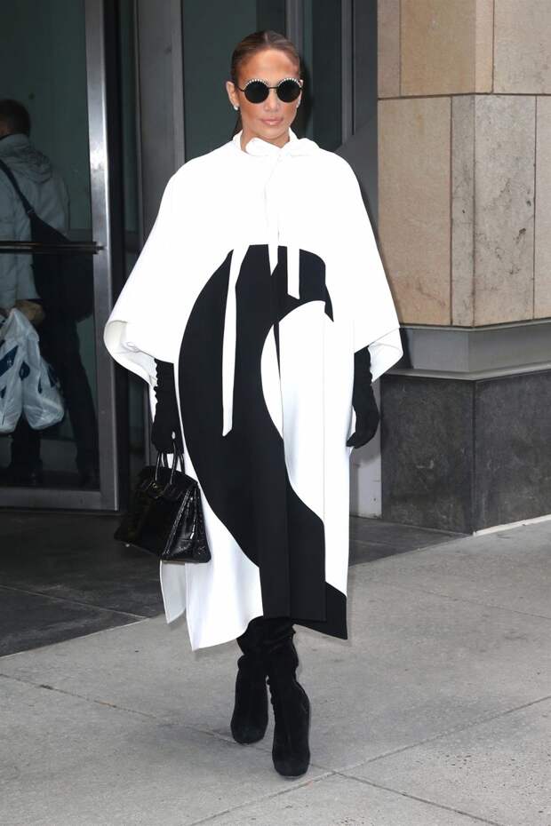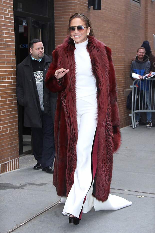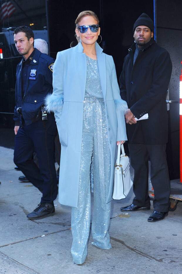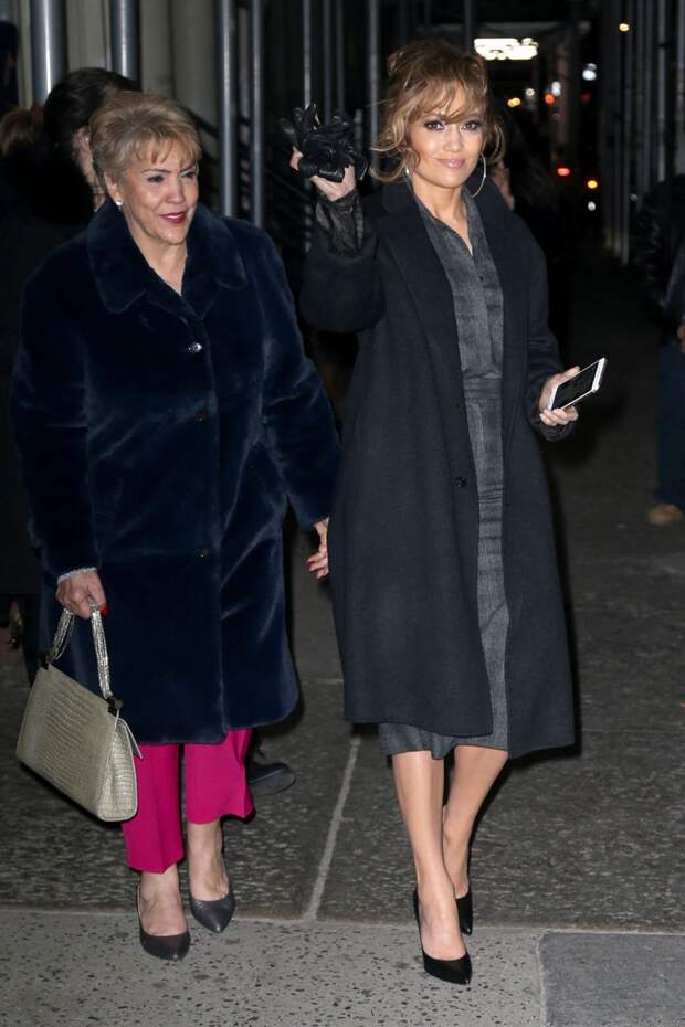 В тот же день Джей Ло надела эффектный кремовый комбинезон Stephane Rolland — жаль, что его длинный шлейф "затерялся" на фото за длинной бордовой шубой. Был среди прочего и комплект от Sally Lapointe в дымчато-голубом оттенке, полностью расшитый пайтеками в паре с пальто от того же бренда и с сумкой Valentino. А самым трогателным выходом стало появление Дженнифер вместе с мамой Гваделупе Родригес — у энергичной звезды время найдется на все и всех.