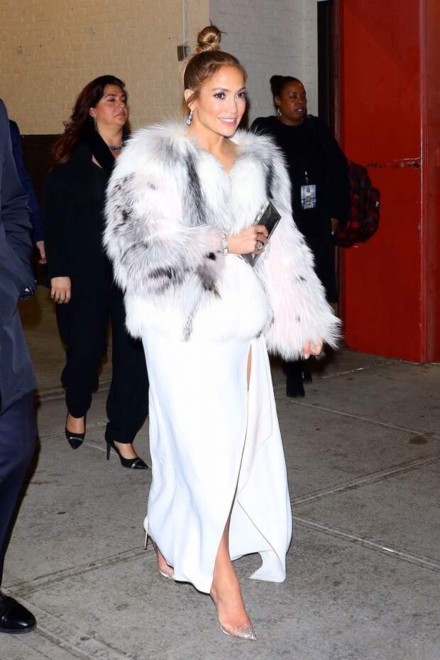 Стоит ли говорить, что других гостей мероприятия вряд ли кто-то запомнил. А вот на афтепати Лопес уже облачилась в белоснежное платье Elie Saab с высоким разрезом — вечеринку наша героиня покидала, накинув сверху короткую пушистую шубу.