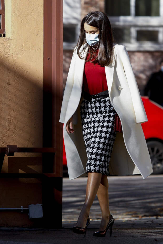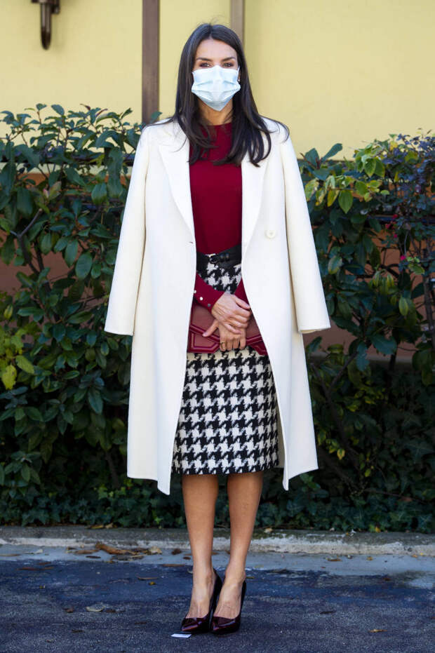 На этот раз супруга испанского короля отважилась примерить белое пальто - и она надела его в дуэте с джемпером оттенка бургунди и черно-белой юбкой Hugo Boss с принтом "гусиная лапка" из жаккардовой ткани. Финальным штрихом ансамбля стали лодочки в тон свитеру. Лаконичный клатч, по-королевски роскошная нейтральная укладка и минимум макияжа - наша героиня не стала экспериментировать там, где и так все идеально.
