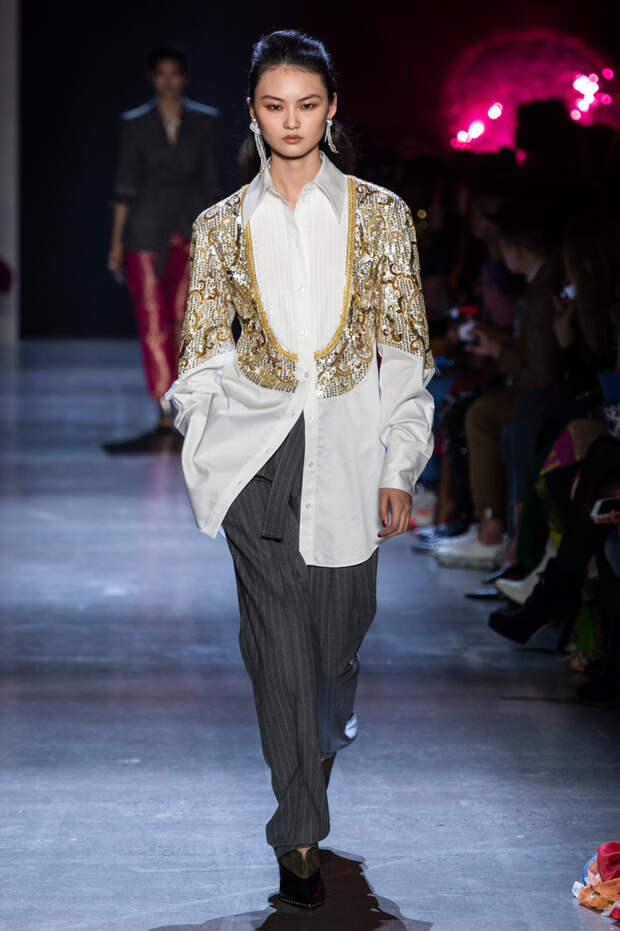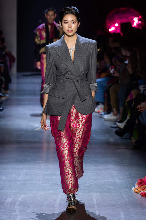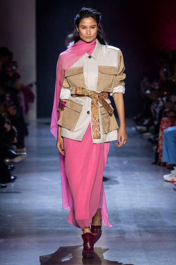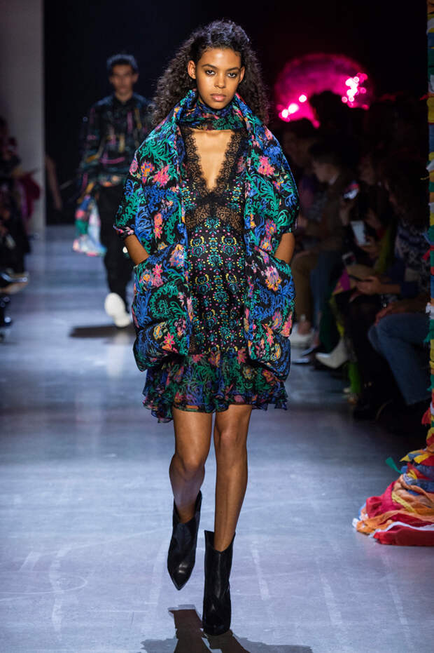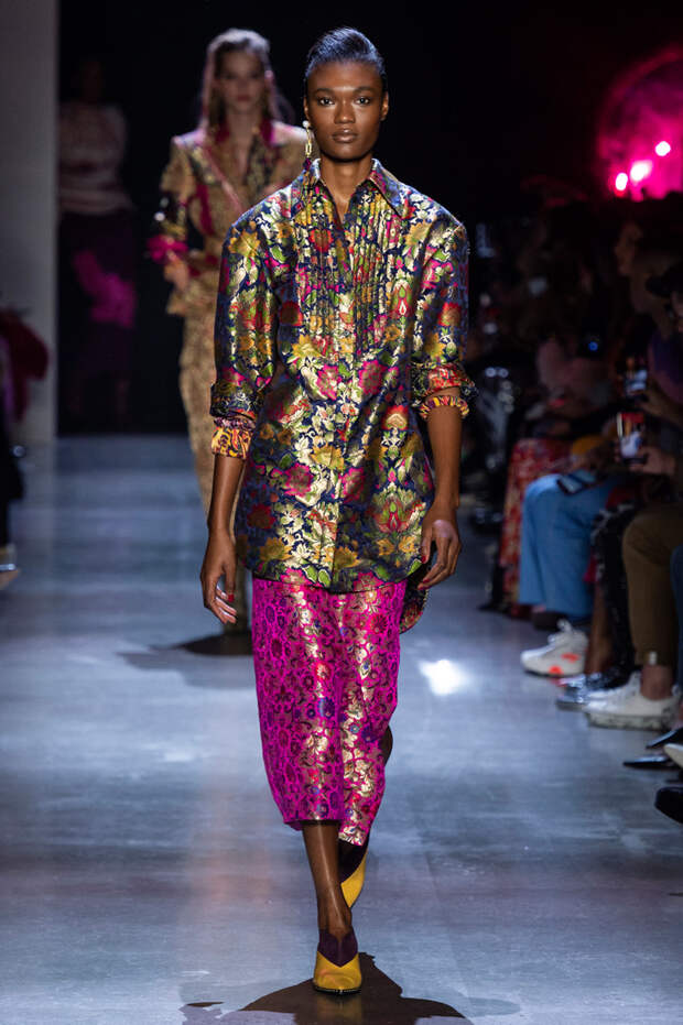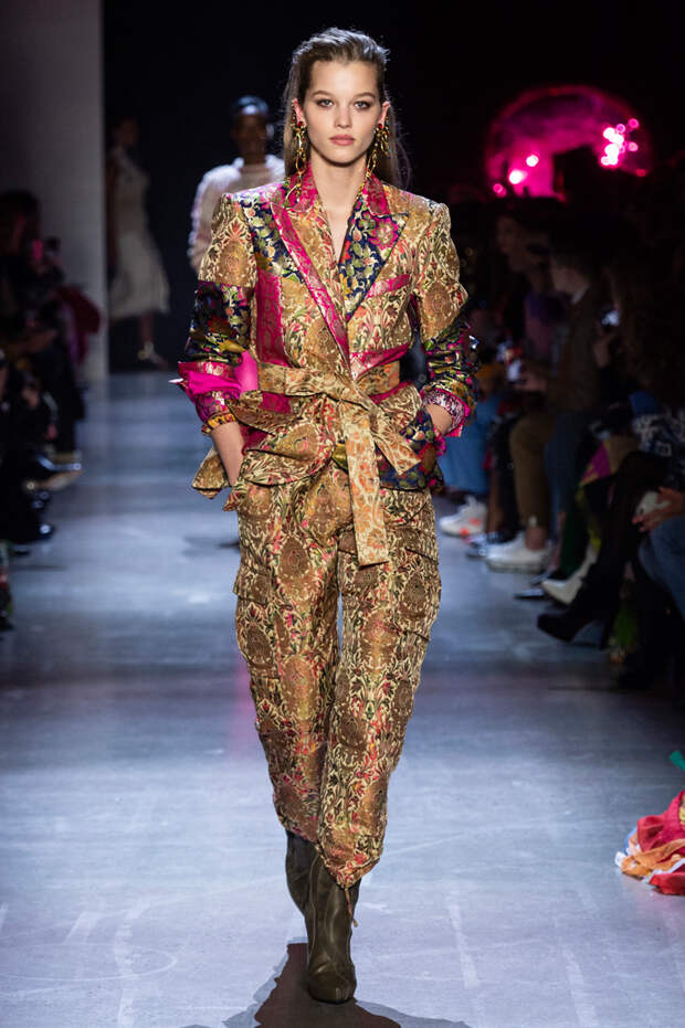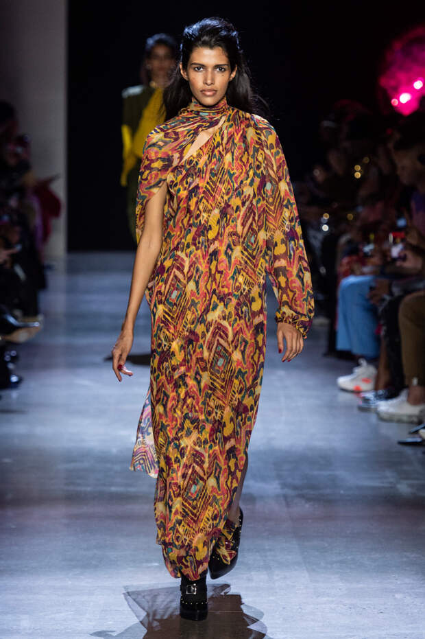 Вдохновился он, впрочем, именно спортивной одеждой Америки 80-х годов. А еще — национальными костюмами Индии.Индийские отсылки не ограничиваются одними только яркими красками, воцарившимися на подиуме. Есть и другие, не менее прямые цитаты в плане уже кроя и силуэтов. Платья, напоминающие сари, длинные туники с широкими брюками, щедрая объемная отделка, узорчатые шаровары под классическими офисными пиджаками — в современную реальность все они, когда за дело берется мастер, вписываются легко. На некоторых вещах — бархатных платьях и комбинезонах, похожих на вечериночную униформу все тех же 80-х, — индийские достопримечательности и вовсе нарисованы, как на открытках.