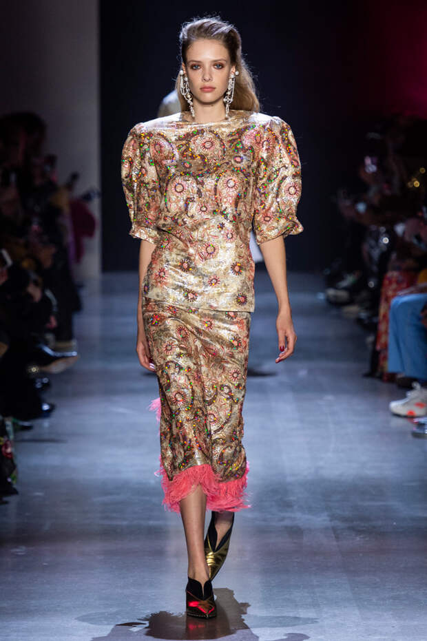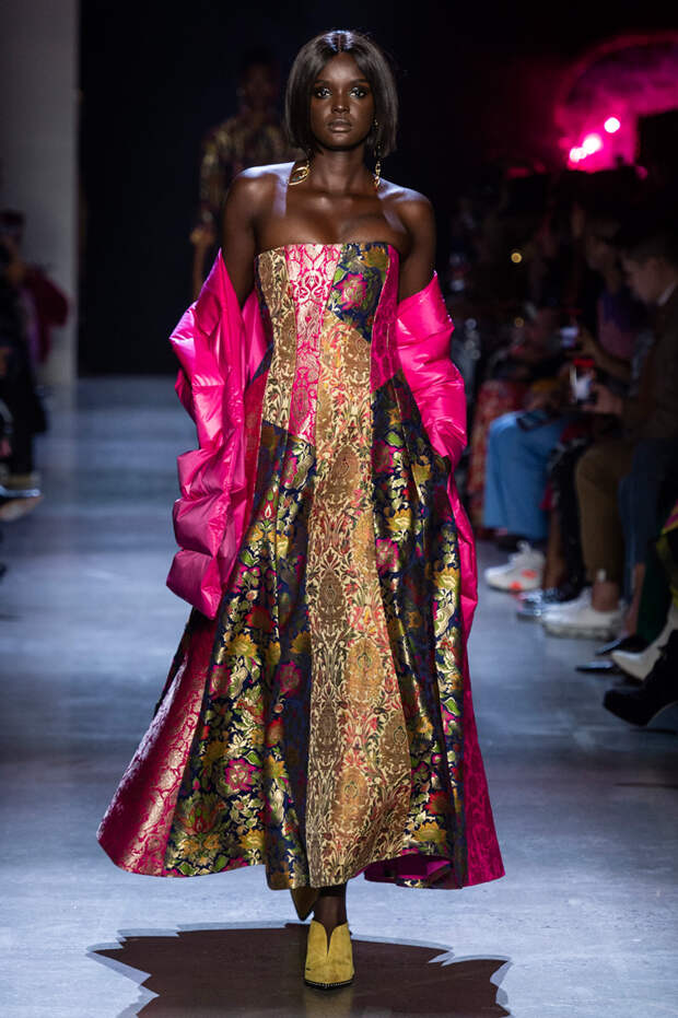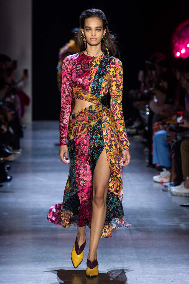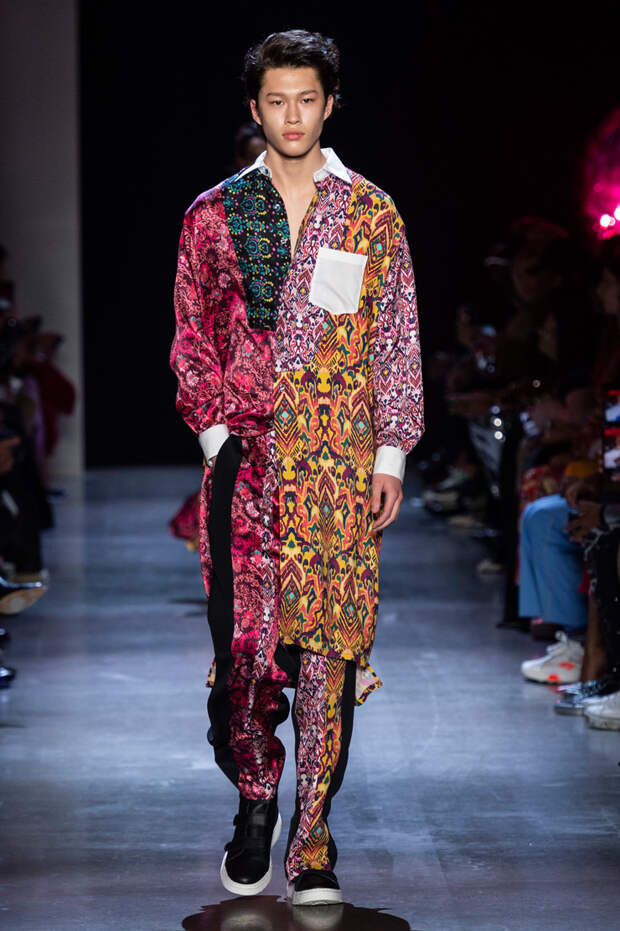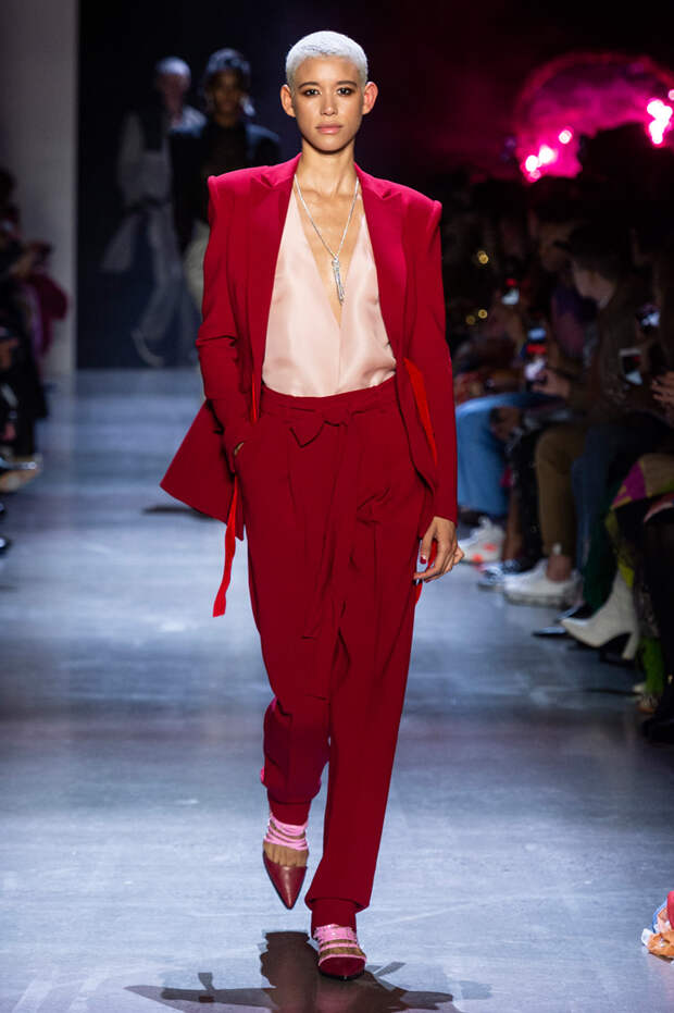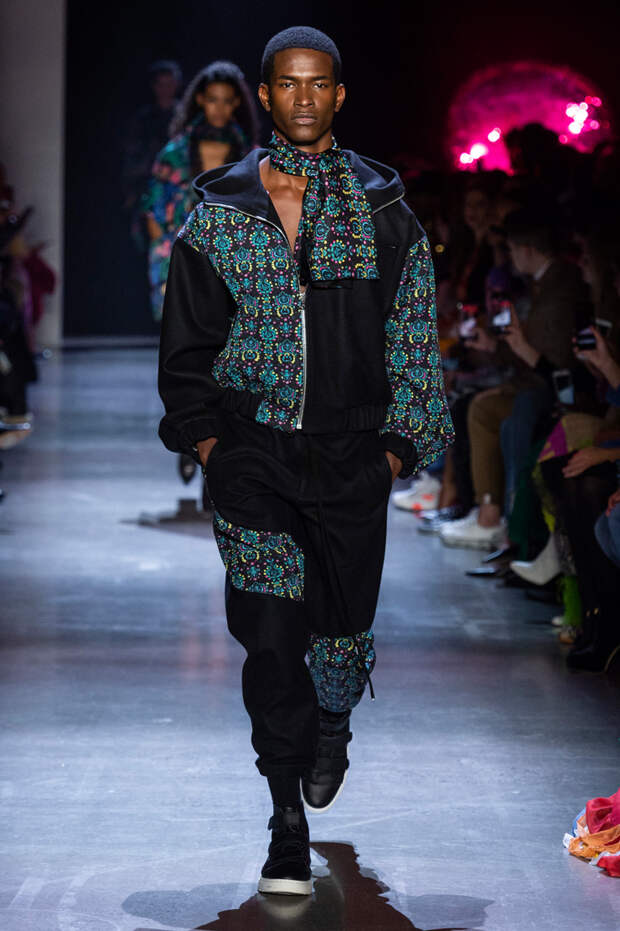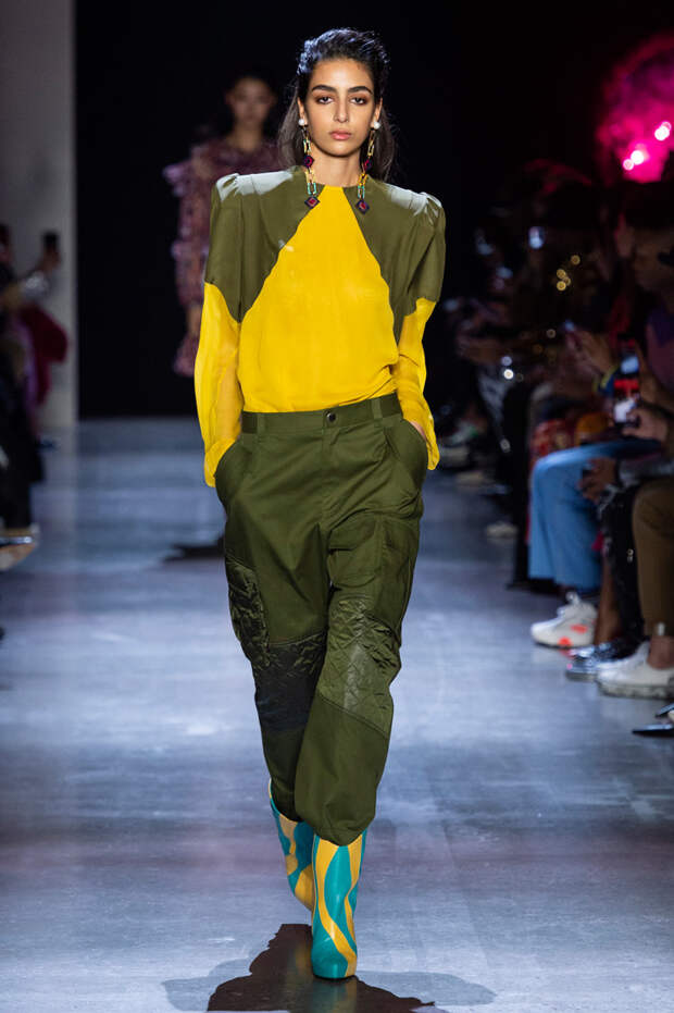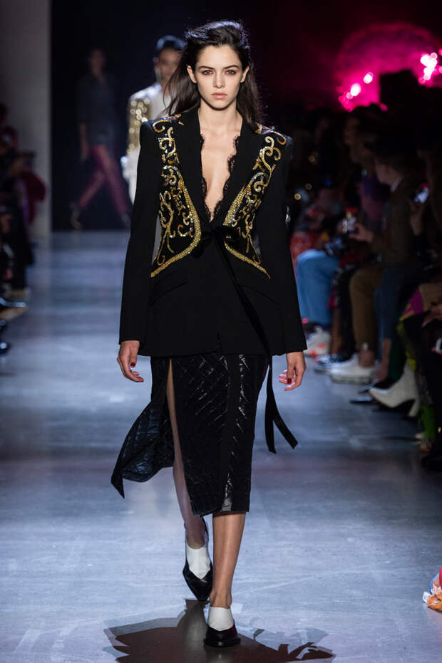 Вдохновился он, впрочем, именно спортивной одеждой Америки 80-х годов. А еще — национальными костюмами Индии.Индийские отсылки не ограничиваются одними только яркими красками, воцарившимися на подиуме. Есть и другие, не менее прямые цитаты в плане уже кроя и силуэтов. Платья, напоминающие сари, длинные туники с широкими брюками, щедрая объемная отделка, узорчатые шаровары под классическими офисными пиджаками — в современную реальность все они, когда за дело берется мастер, вписываются легко. На некоторых вещах — бархатных платьях и комбинезонах, похожих на вечериночную униформу все тех же 80-х, — индийские достопримечательности и вовсе нарисованы, как на открытках.