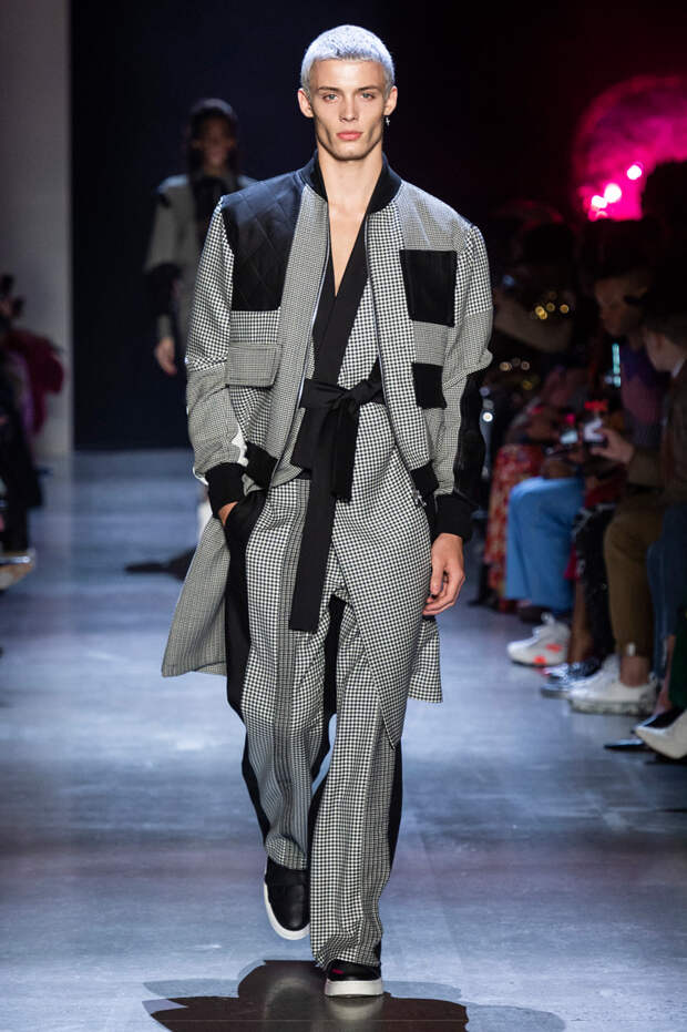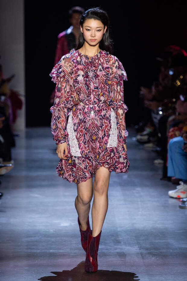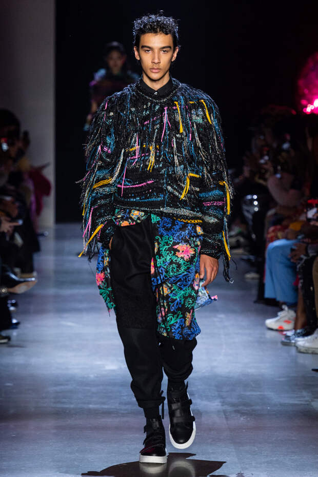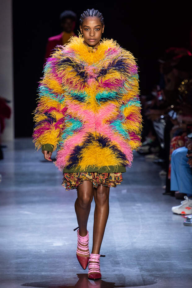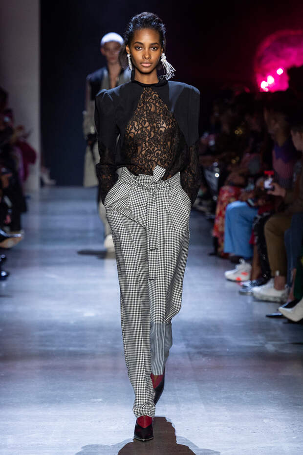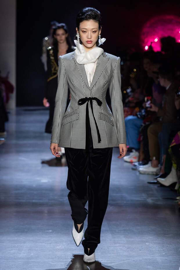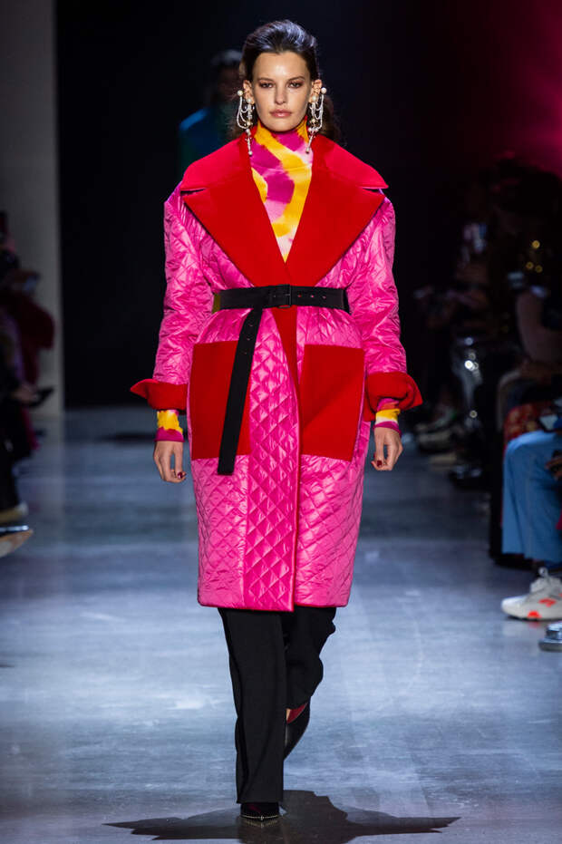 Вдохновился он, впрочем, именно спортивной одеждой Америки 80-х годов. А еще — национальными костюмами Индии.Индийские отсылки не ограничиваются одними только яркими красками, воцарившимися на подиуме. Есть и другие, не менее прямые цитаты в плане уже кроя и силуэтов. Платья, напоминающие сари, длинные туники с широкими брюками, щедрая объемная отделка, узорчатые шаровары под классическими офисными пиджаками — в современную реальность все они, когда за дело берется мастер, вписываются легко. На некоторых вещах — бархатных платьях и комбинезонах, похожих на вечериночную униформу все тех же 80-х, — индийские достопримечательности и вовсе нарисованы, как на открытках.