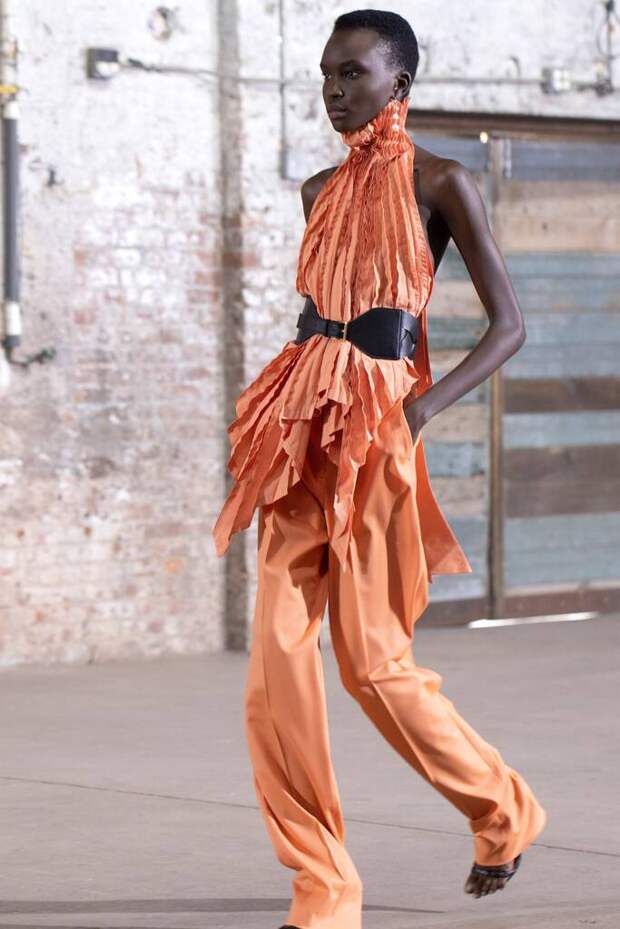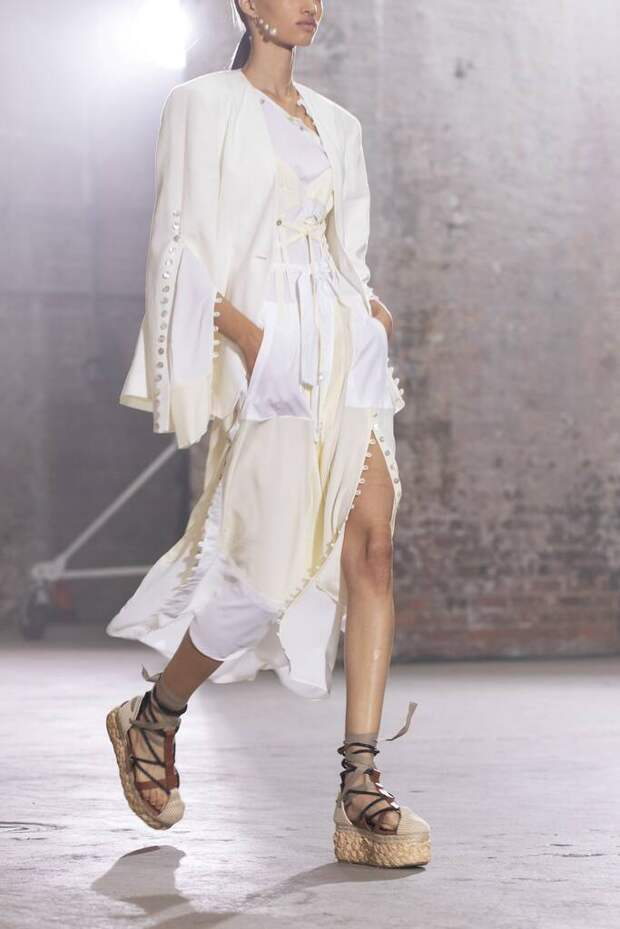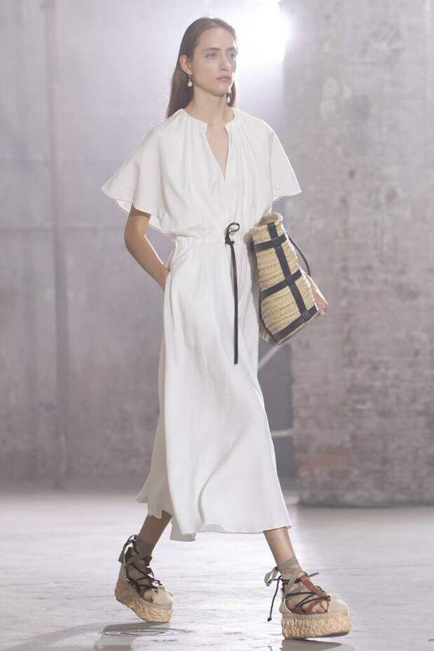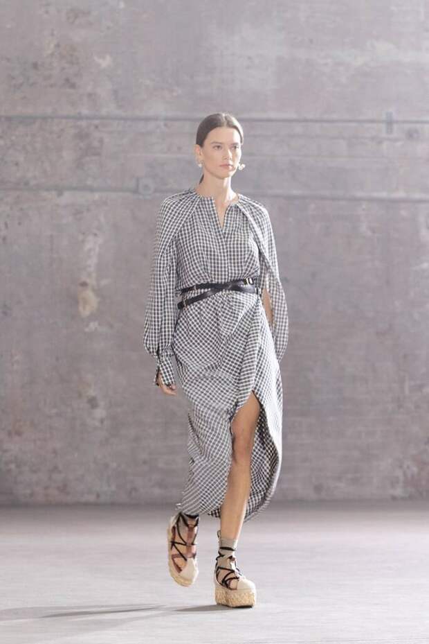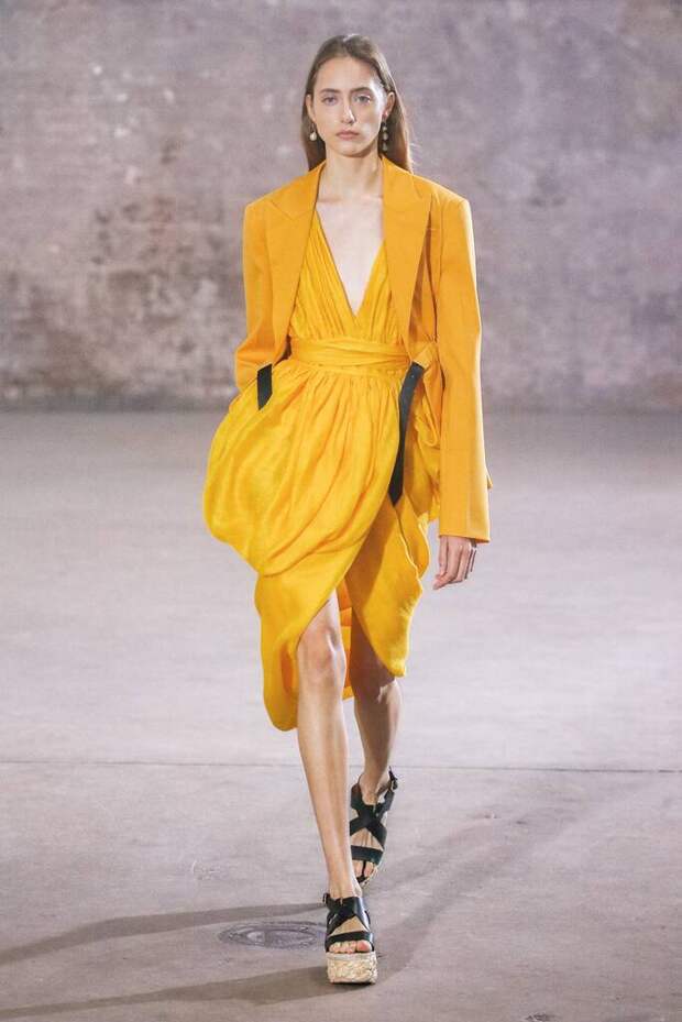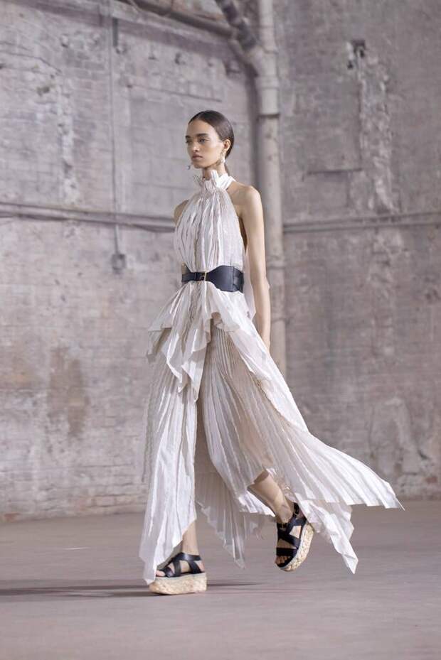 В отличие от прошлого сезона, когда Альтузарра обратился к теме наследия, корней и стилю 50-х (вероятно, сказалось отцовство — у него только-только родилась дочь), в этот раз он решил полностью быть в сегодняшнем дне. И несмотря на то, что большая часть силуэтов была так или иначе вдохновлена стилем 90-х, получившиеся образы все же выглядели очень свежо и современно. Возможно, дело в чистых цветах (цветовая гамма варьировалась от горчичного до темно-синего и кораллового) или лаконичных силуэтах. Так или иначе, в коллекции хватало вещей, которые хочется носить здесь и сейчас. Это и безупречно скроенные брючные костюмы, и платья со сложными драпировками, и комплекты из кожи (кажется, этот осенний тренд с нами надолго), и вещи из тонкого трикотажа. Все их объединяла безупречность линий и бескомпромиссная актуальность кроя. Отдельного внимания заслуживают аксессуары: украшения из жемчуга в несколько рядов, которые как бы "врастают" в одежду и становятся ее частью, а также эспадрильи на толстой подошве. Уверены, что уже через полгода они разлетятся по лентам соцсетей и отчетам стритстайл-фотографов.