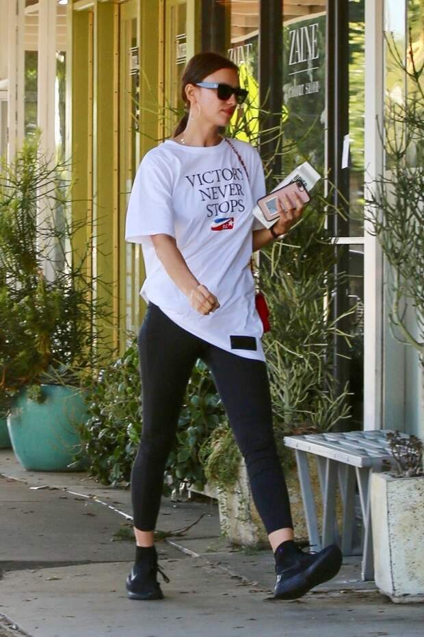 Отметив российский День матери вместе с дочерью Леей, Брэдли Купером и его коллегой по "Мальчишнику в Вегасе" Заком Галифианакисом, Ирина Шейк решила уделить время себе и отправилась на шопинг в Лос-Анджелесе в одиночестве. Для прогулки по местным магазинам модель выбрала комфортный образ: белую футболку из коллаборации Рикардо Тиши и Nike с надписью Victory Never Stops, плотные черные легинсы и кроссовки в тон.