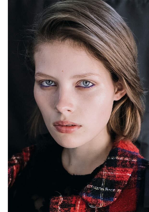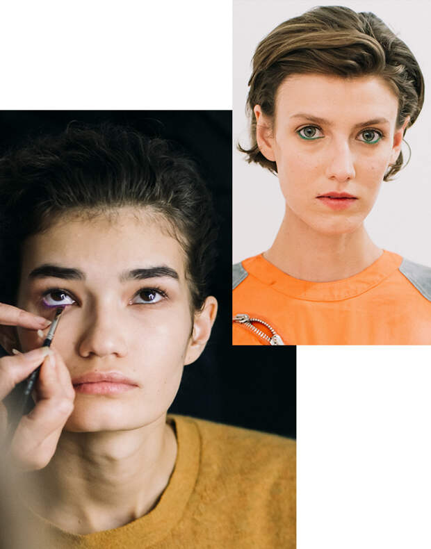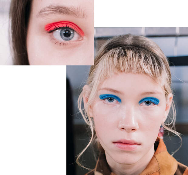 Здесь и оранжевый, и бирюзовый, и зеленый, и фиолетовый - никакой скуки. Тон и губы оставили естественными, чтобы ничто не отвлекало внимания от глаз.Что касается волос, то уклон был сделан в сторону ретростилистики: укладки в традициях 60-х, «рваные» стрижки и накладные, будто стриженые, челки.