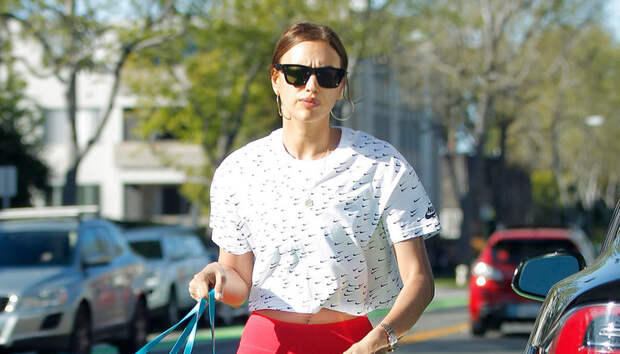Ирина Шейк — большая поклонница athleisure: россиянка любит подчеркивать точеную фигуру при помощи облегающих спортивных брюк и коротких топов. Вот и на сеанс массажа в один из салонов Брентвуда модель отправилась в ярко-алых легинсах, белоснежном кроп-топе с принтом Nike и комфортных кроссовках.