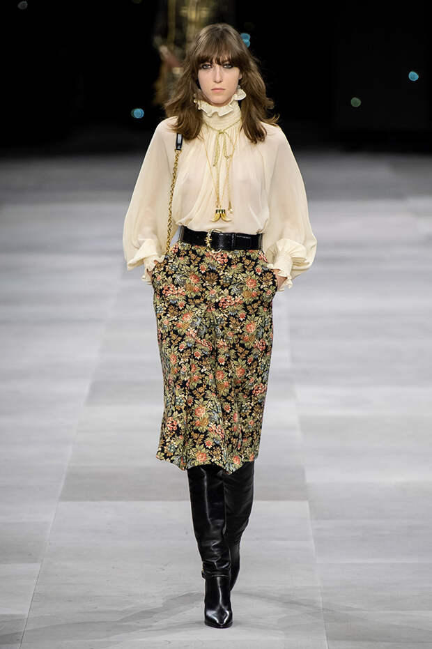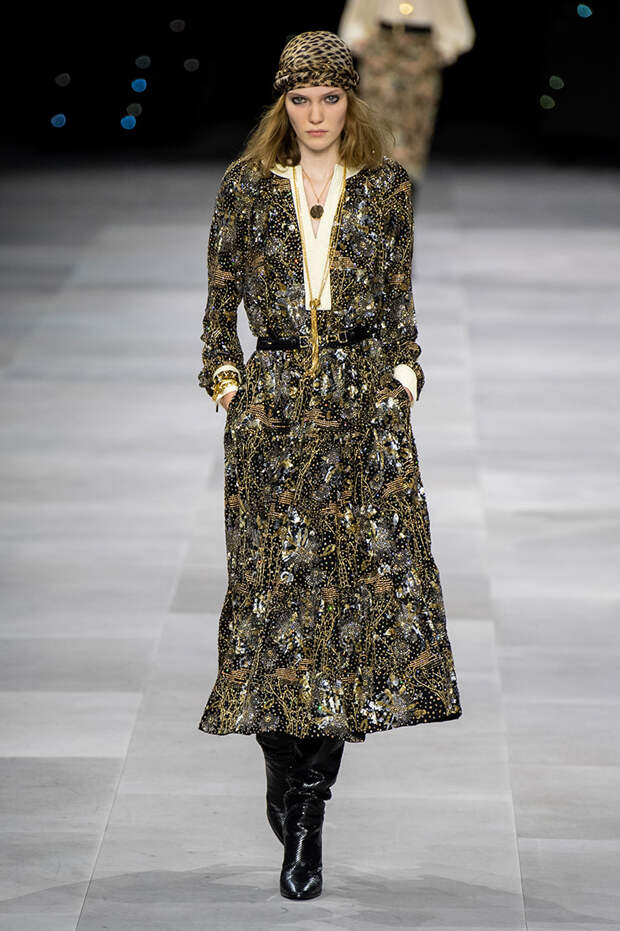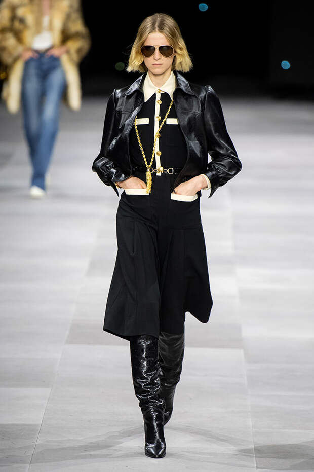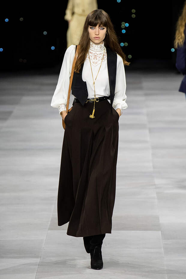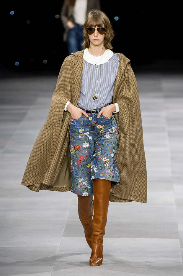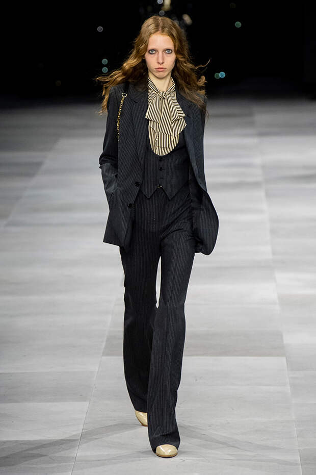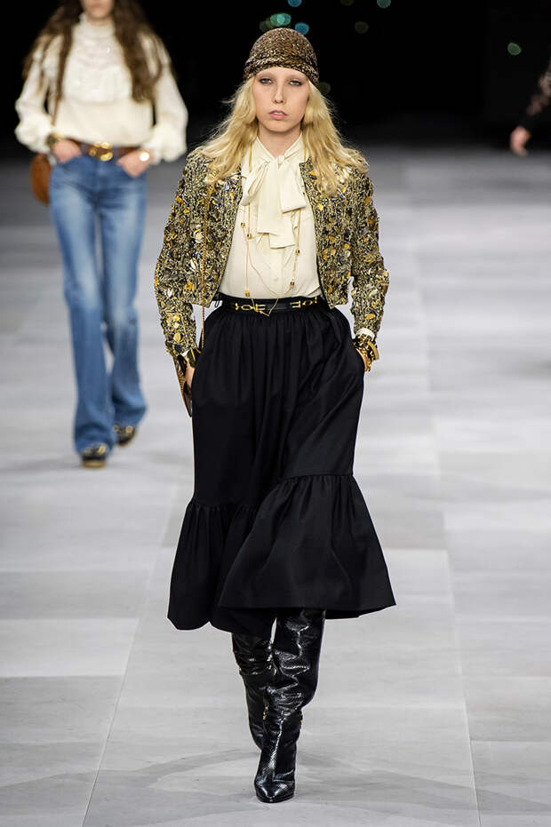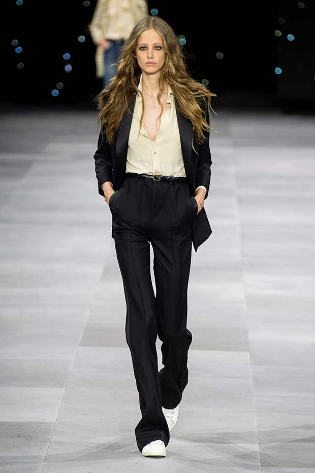 Первая коллекция дизайнера для нового дома оправдала худшие ожидания: Слиман остался Слиманом и попытался, кажется, переделать стиль марки полностью под себя. Но, похоже, в ней он как раз прошался с дорогим сердцу рок-н-роллом: уже осенью он сменил юных тусовщиц на буржуазных дам. И вместо лихих платьев и вечериночного шика сосредоточился на шике повседневности, обыденности. На том, чтобы сделать стандартный "взрослый" гардероб cool again. Главным сочетанием всей коллекции неожиданно стала не вечная слимановская пара "рваные колготки + черное мини", а квадратный жакет с блузой и юбкой миди — то есть набор, который вряд ли кому-то в 2019 году до него приходило в голову назвать крутым. Ну а теперь — приходит.