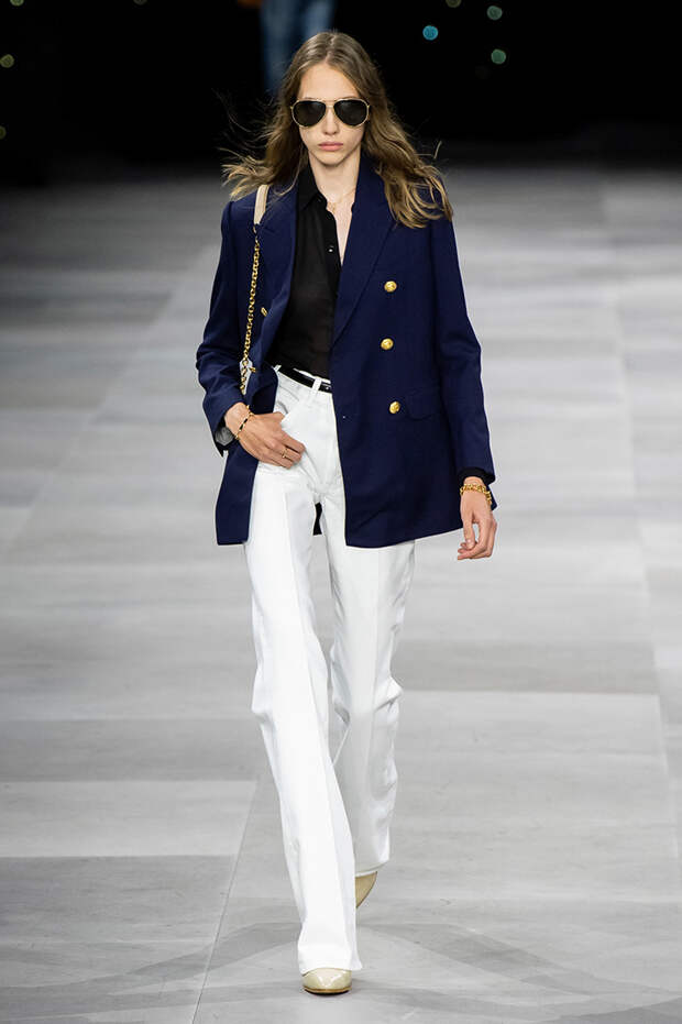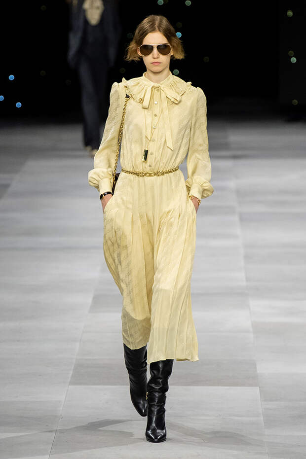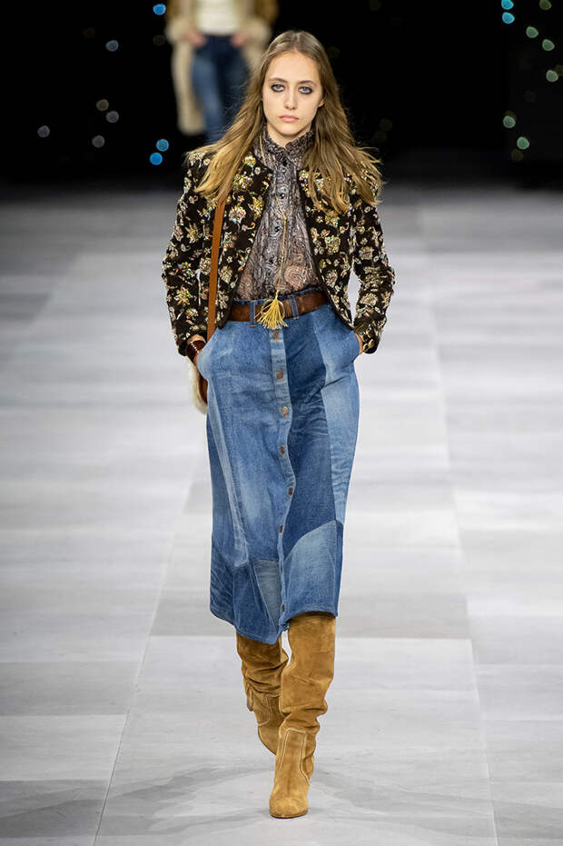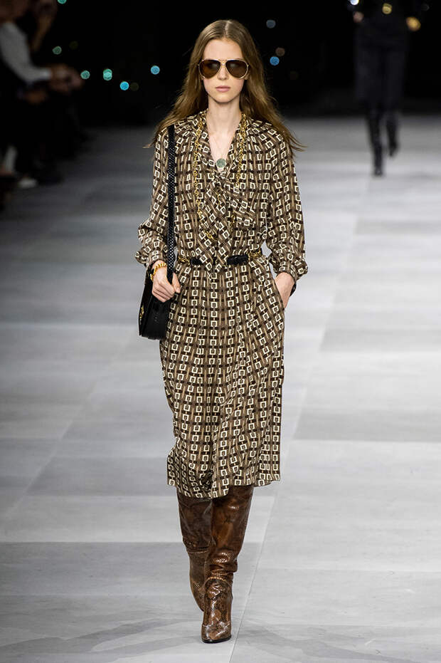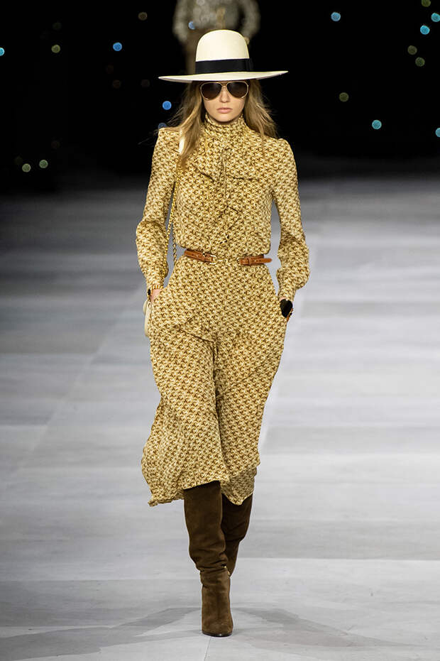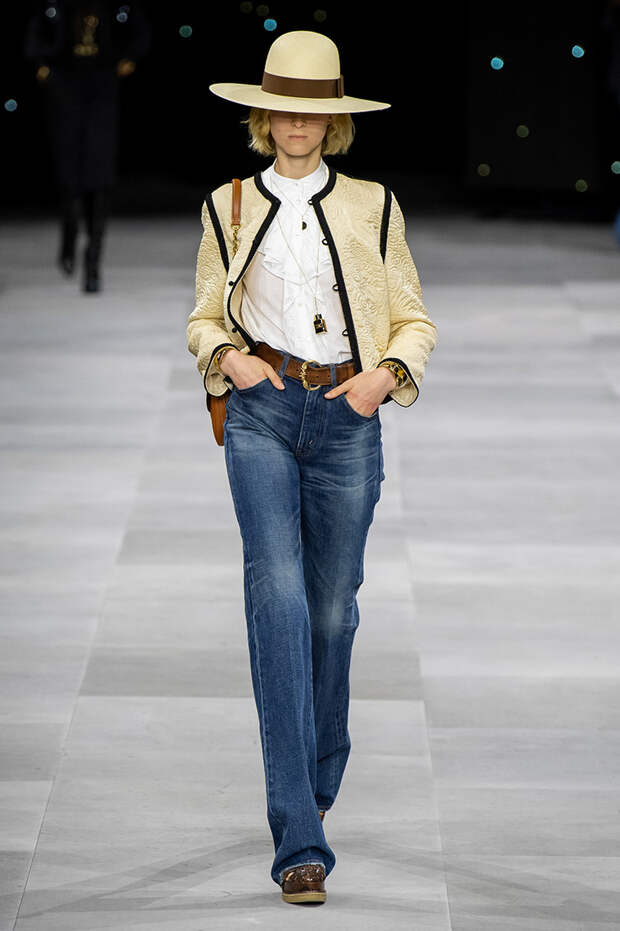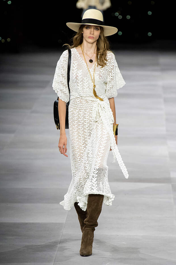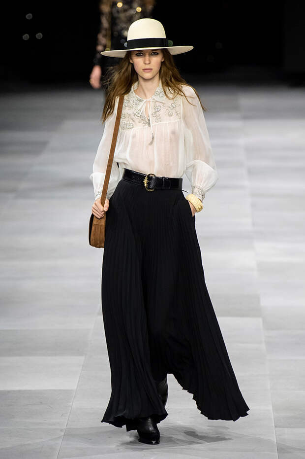 Первая коллекция дизайнера для нового дома оправдала худшие ожидания: Слиман остался Слиманом и попытался, кажется, переделать стиль марки полностью под себя. Но, похоже, в ней он как раз прошался с дорогим сердцу рок-н-роллом: уже осенью он сменил юных тусовщиц на буржуазных дам. И вместо лихих платьев и вечериночного шика сосредоточился на шике повседневности, обыденности. На том, чтобы сделать стандартный "взрослый" гардероб cool again. Главным сочетанием всей коллекции неожиданно стала не вечная слимановская пара "рваные колготки + черное мини", а квадратный жакет с блузой и юбкой миди — то есть набор, который вряд ли кому-то в 2019 году до него приходило в голову назвать крутым. Ну а теперь — приходит.