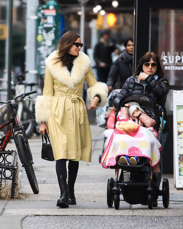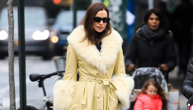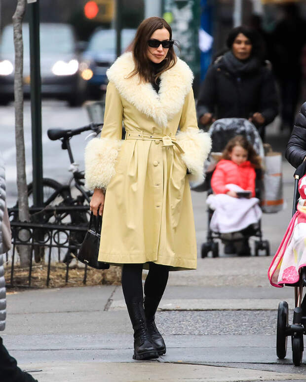 Ирина выбрала модель пастельно-желтого цвета с волнистым мехом ламы - достойный ответ серым будням. Такую самодостаточную вещь не стоит сочетать с другими трендовыми вещами, чтобы не перегрузить образ. Супермодель придерживается этому правилу, сочетая его с базовым черным тотал-луком: водолазка, леггинсы и высокие ботинки на шнуровке. Очки с ноткой ретро закрепляют за Ириной звание звезды стритстайла.