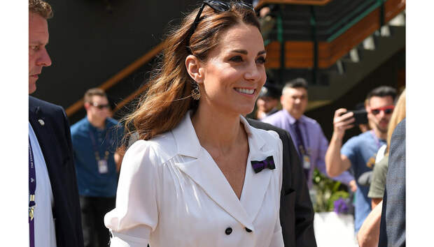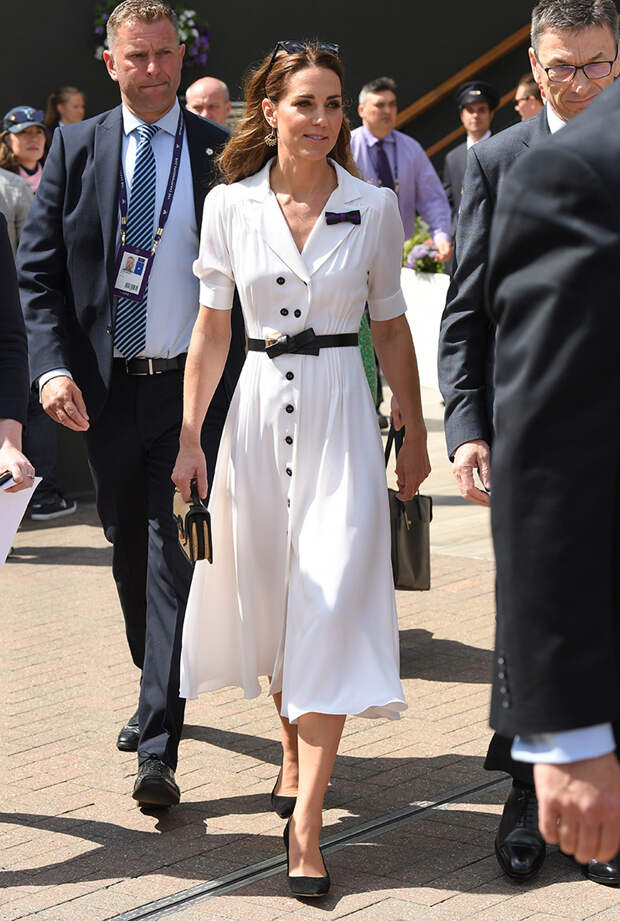 Дождались: наконец Кейт Миддлтон посетила Уимблдонский турнир, начавшийся 24 июня. Герцогиня Кембриджская была замечена на матче Кристины Макхейл и Хариет Дарт. Для выхода она выбрала летящее белоснежное миди-платье Suzannah с черными пуговицами и рукавами-фонариками, которое дополнила черными лодочками Gianvito Rossi на устойчивом среднем каблуке, кожаным поясом на талию от Alexander McQueen и миниатюрной плетеной сумкой того же бренда.