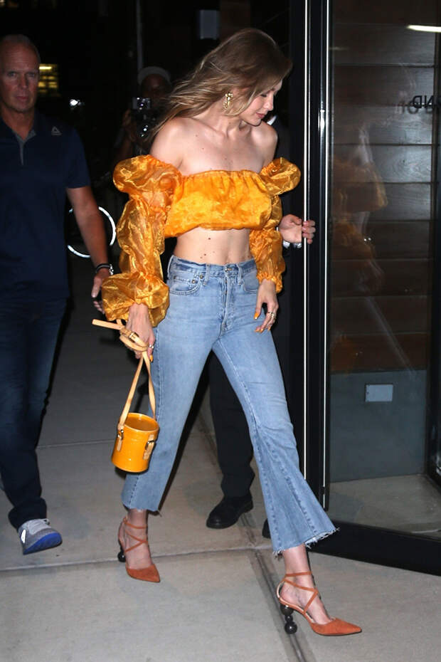 Как превратить синие джинсы в вечерний образ? Добавить к ним романтичный топ с объемными рукавами и открытыми плечами, каблуки и маленькую сумочку. Готово. В таком образе смело отправляйтесь на вечеринку или свидание. Джиджи Хадид предпочла последний вариант. Обратите внимание цвет - Gen Z yellow, самый популярный в этом сезоне.