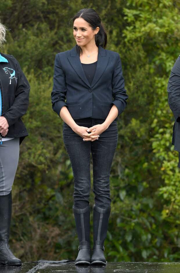В Новой Зеландии, где сейчас гостят Меган Маркл и принц Гарри, погода не балует: мало того, что там прогремело землетрясение магнитудой 6,2, так еще и зарядили проливные дожди. Впрочем, обилие осадков не слишком испугало герцогиню Сассекскую: свой сегодняшний визит в Окленд она начала в уютном образе из темно-синего блейзера Karen Walker, джинсов J.