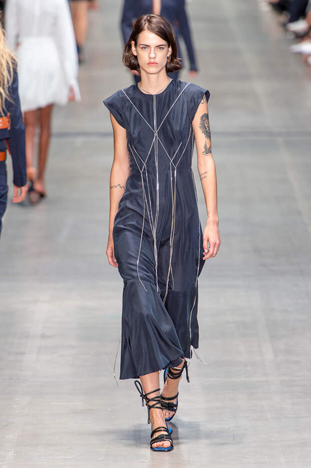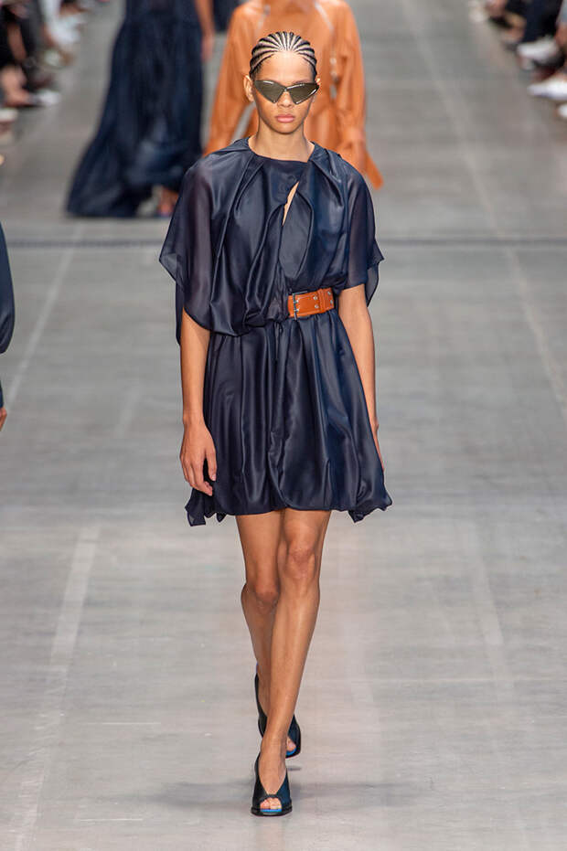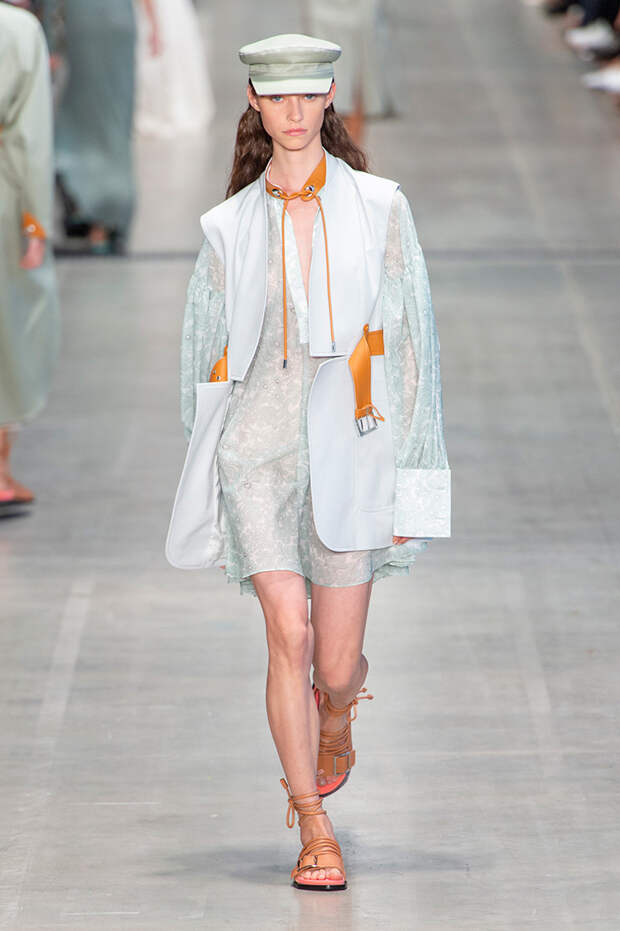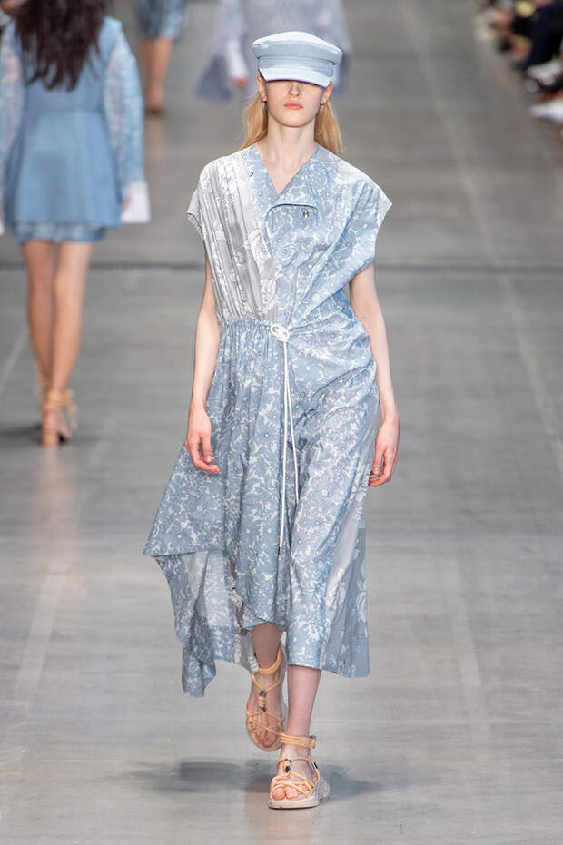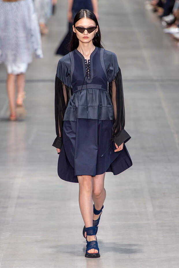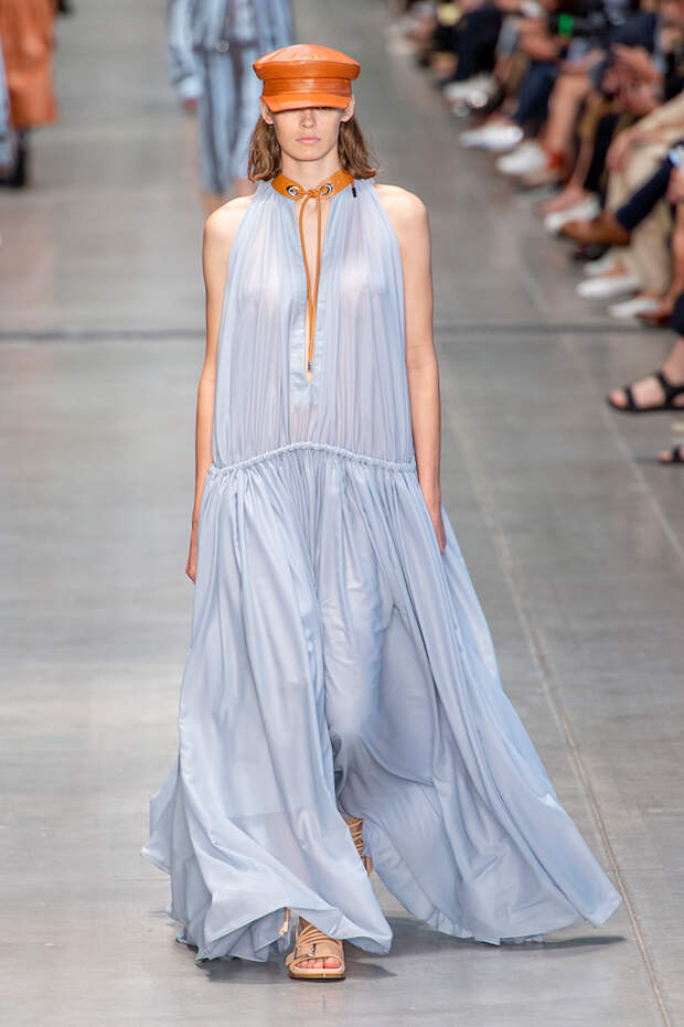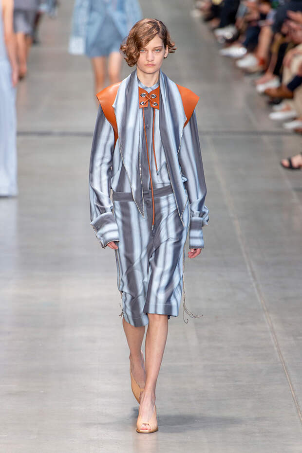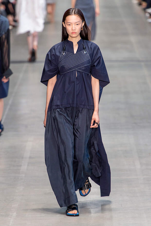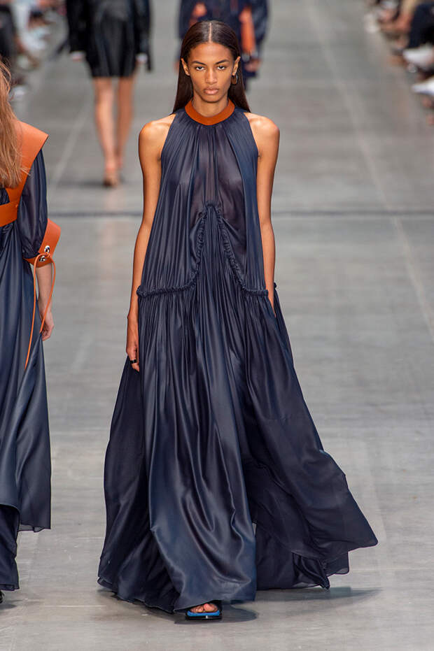 Струящаяся ткань, судя по всему, довольно плотная, выглядела влажной, даже чуть мерцающей от дождя. И через темно-синюю дымку проглядывали очертания девичьего тела и нижнего белья: а ведь именно в этом эффекте и заключается, пожалуй, львиная доля всей романтичности летних дождей.Назвать "дождливой" можно в общем и цветовую гамму коллекции: в ней в основном оттенки синего и сизого, а пудрово-розовый и коричневый выступают с ними на контрасте. Например, когда к тем же летящим свободным платьям неожиданно добавляются детали из кожи — манжеты, воротники и манишки.