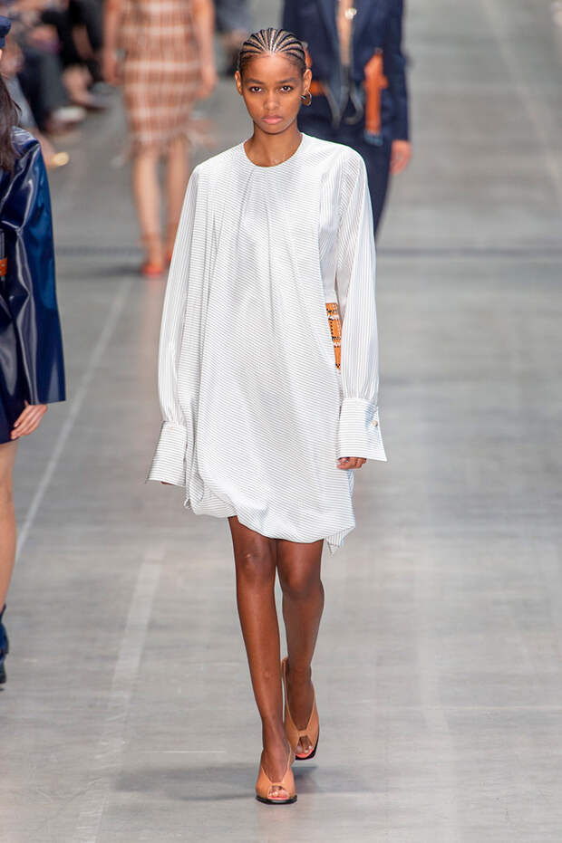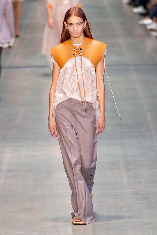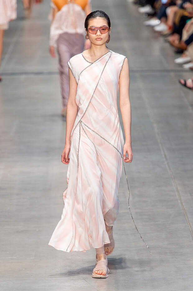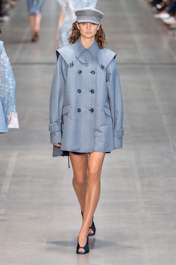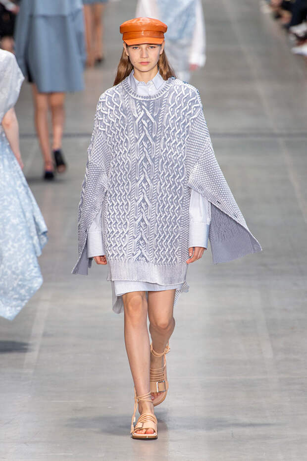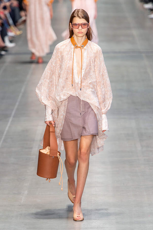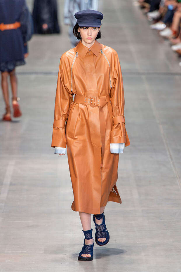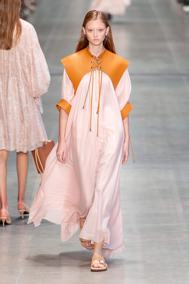 Струящаяся ткань, судя по всему, довольно плотная, выглядела влажной, даже чуть мерцающей от дождя. И через темно-синюю дымку проглядывали очертания девичьего тела и нижнего белья: а ведь именно в этом эффекте и заключается, пожалуй, львиная доля всей романтичности летних дождей.Назвать "дождливой" можно в общем и цветовую гамму коллекции: в ней в основном оттенки синего и сизого, а пудрово-розовый и коричневый выступают с ними на контрасте. Например, когда к тем же летящим свободным платьям неожиданно добавляются детали из кожи — манжеты, воротники и манишки.