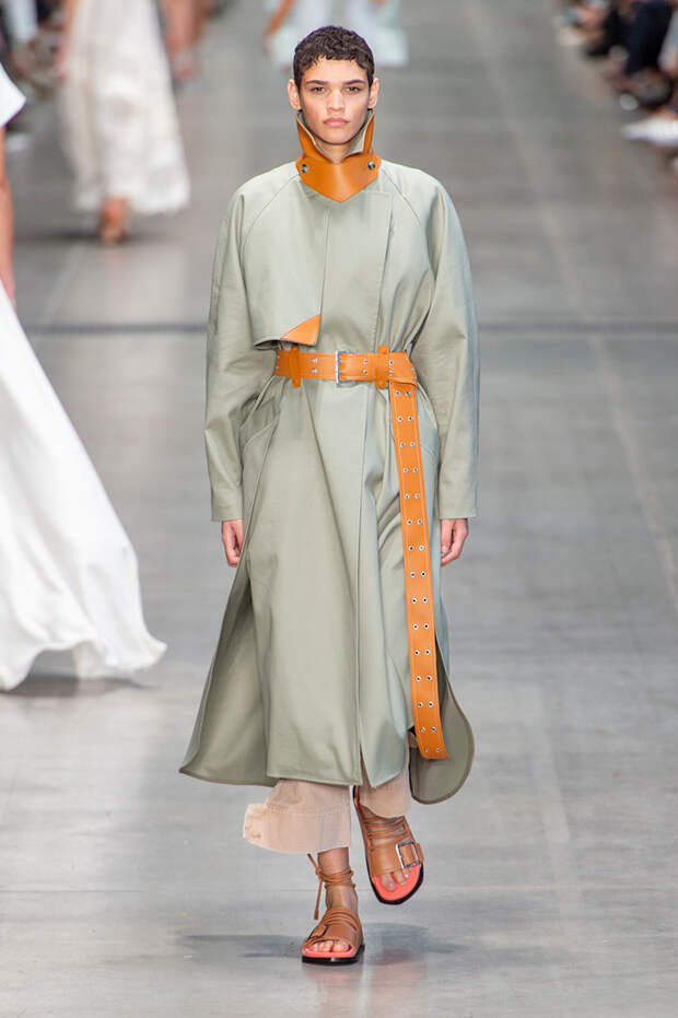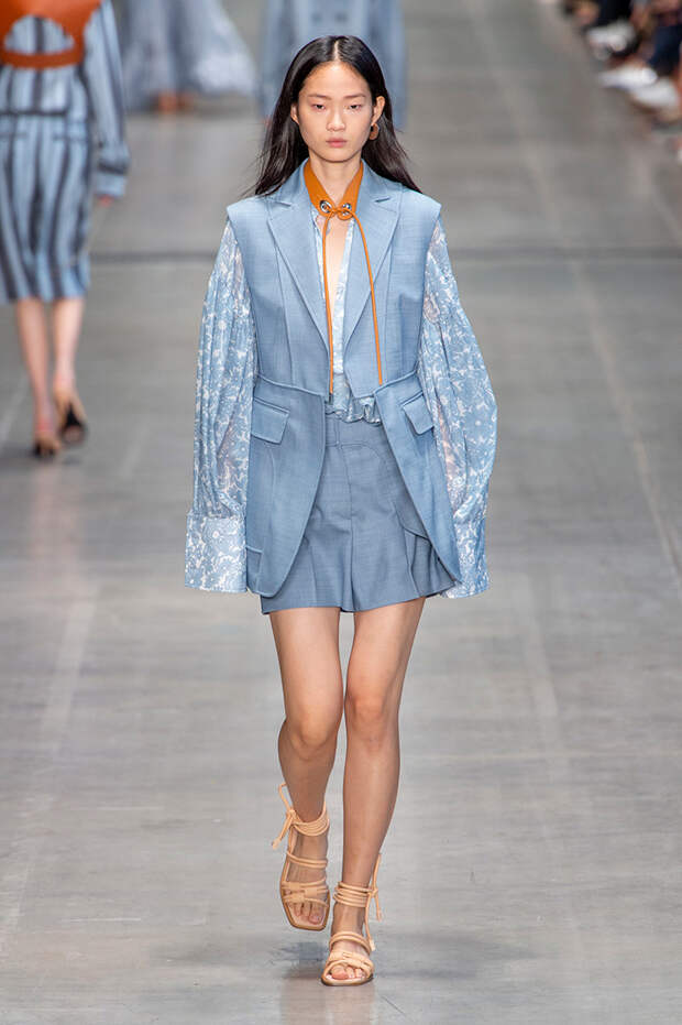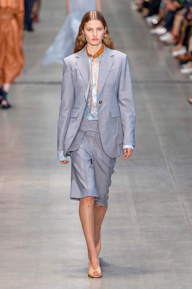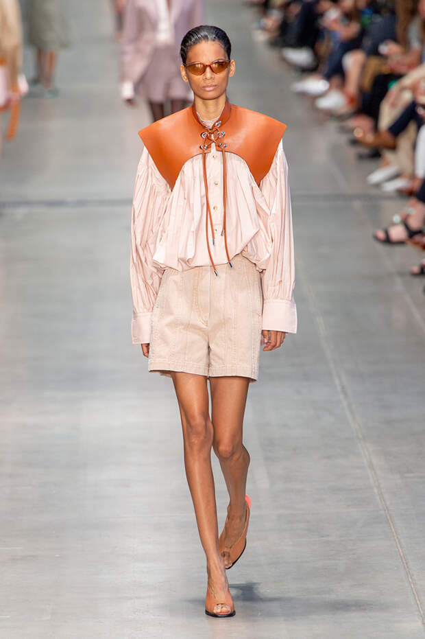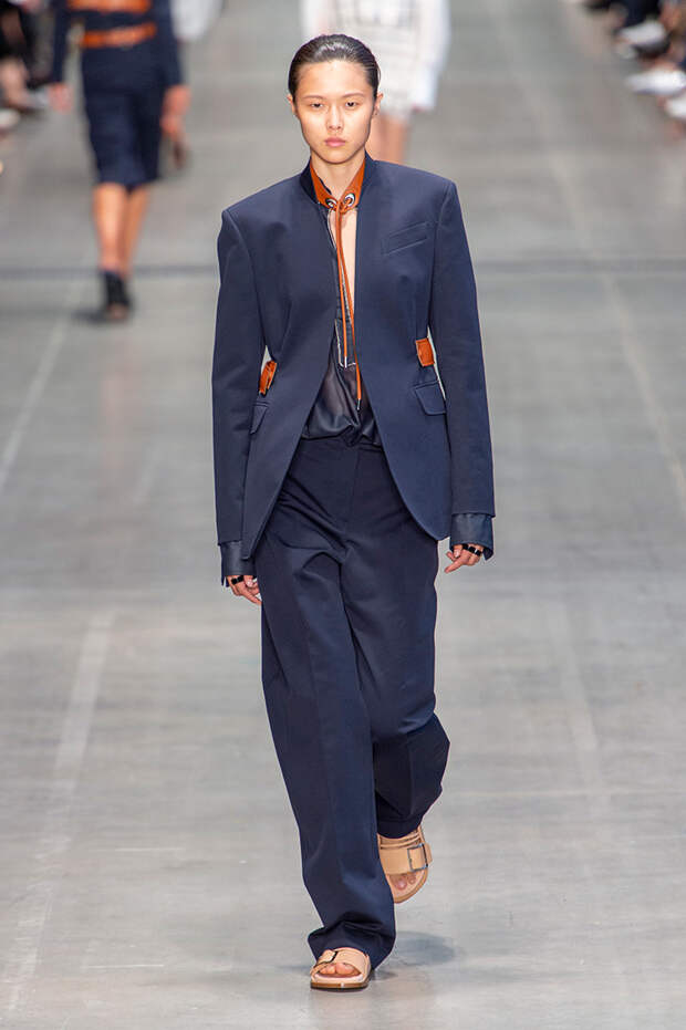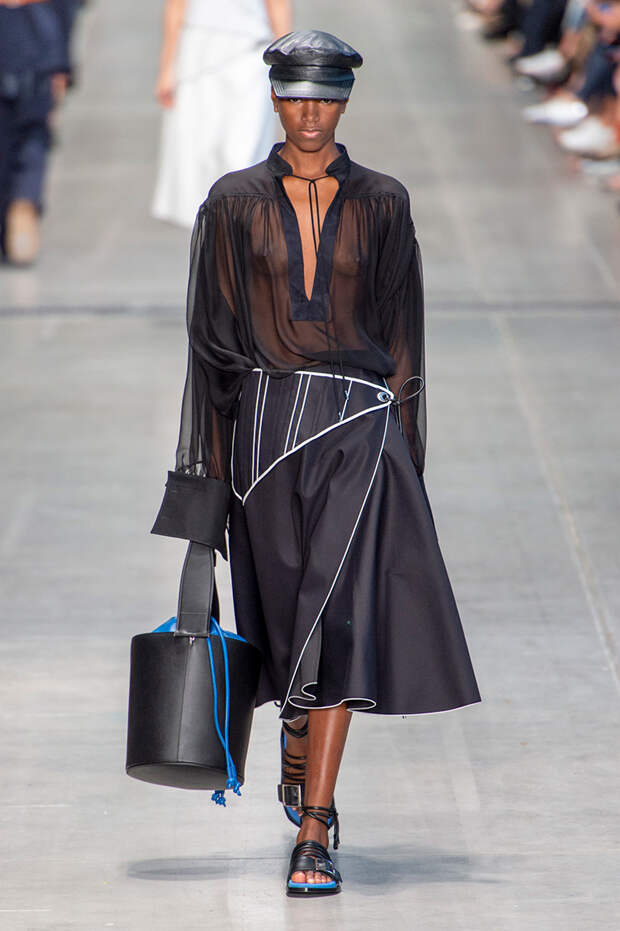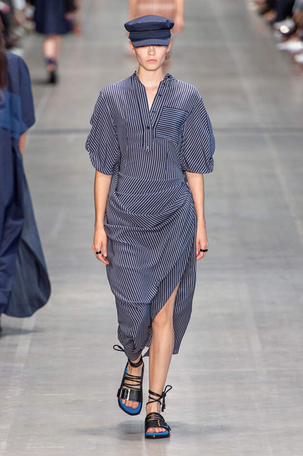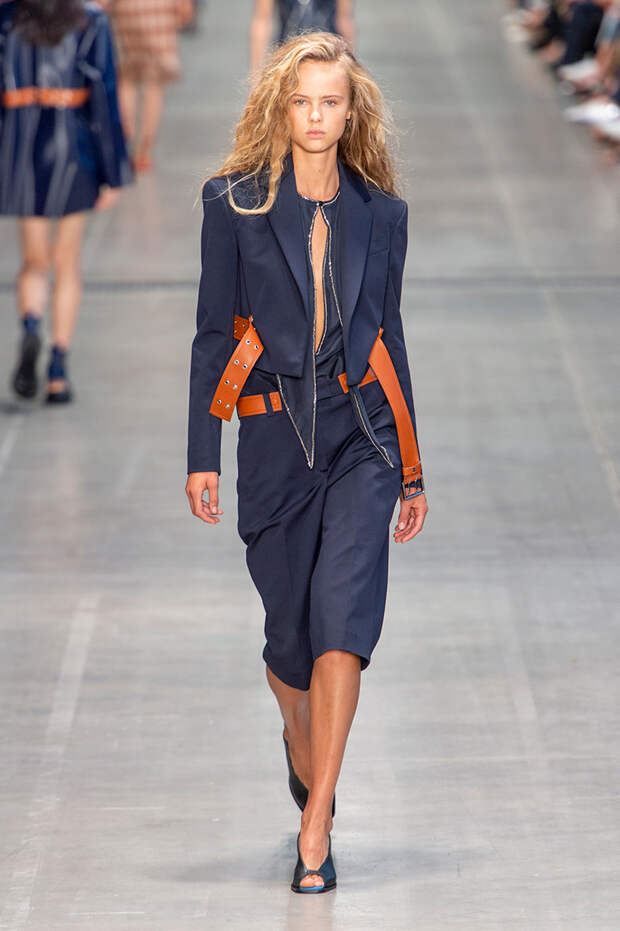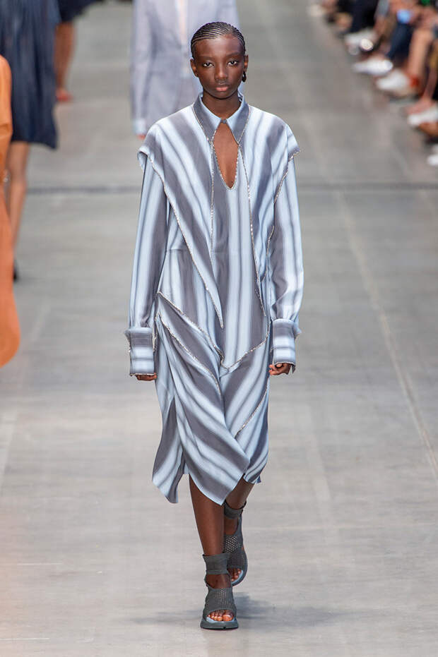 Струящаяся ткань, судя по всему, довольно плотная, выглядела влажной, даже чуть мерцающей от дождя. И через темно-синюю дымку проглядывали очертания девичьего тела и нижнего белья: а ведь именно в этом эффекте и заключается, пожалуй, львиная доля всей романтичности летних дождей.Назвать "дождливой" можно в общем и цветовую гамму коллекции: в ней в основном оттенки синего и сизого, а пудрово-розовый и коричневый выступают с ними на контрасте. Например, когда к тем же летящим свободным платьям неожиданно добавляются детали из кожи — манжеты, воротники и манишки.