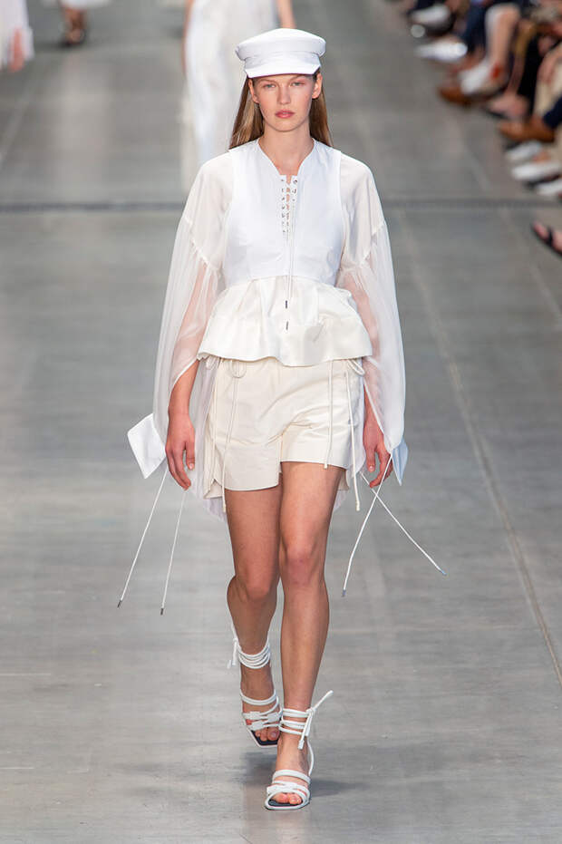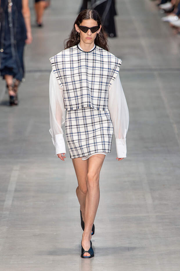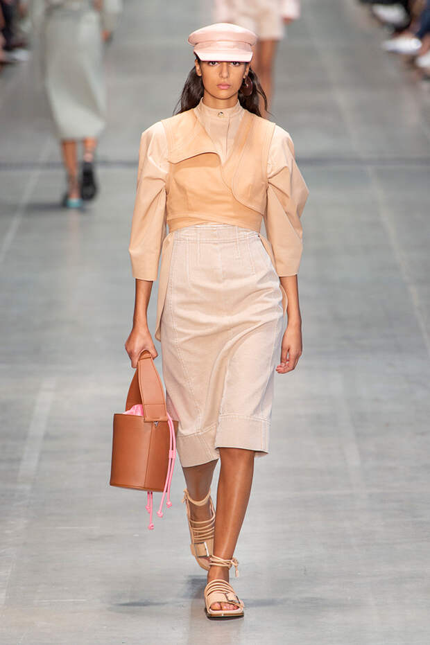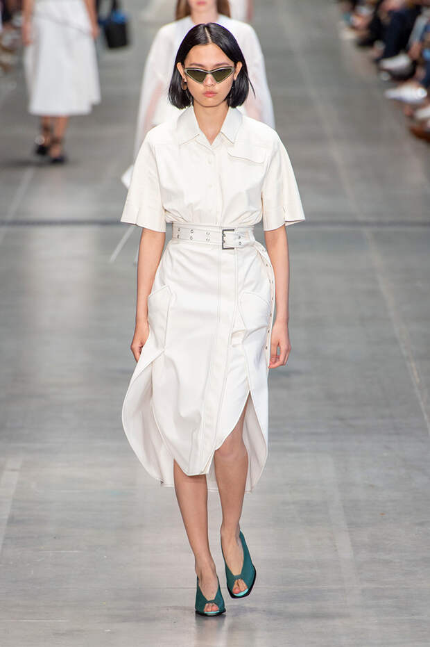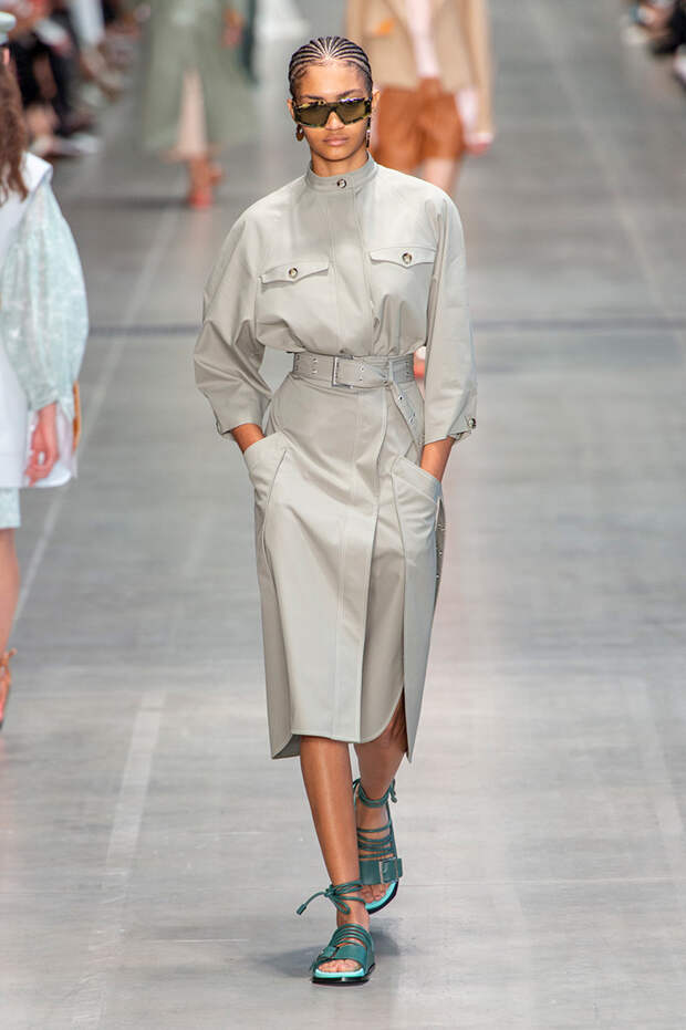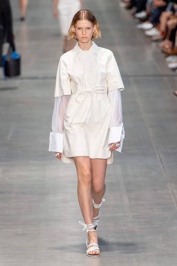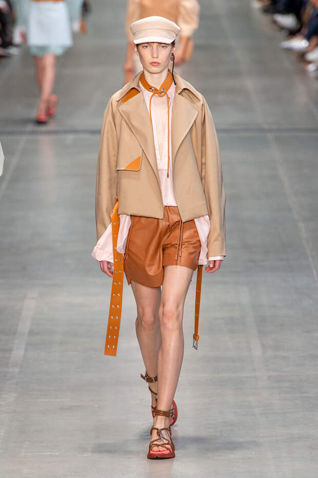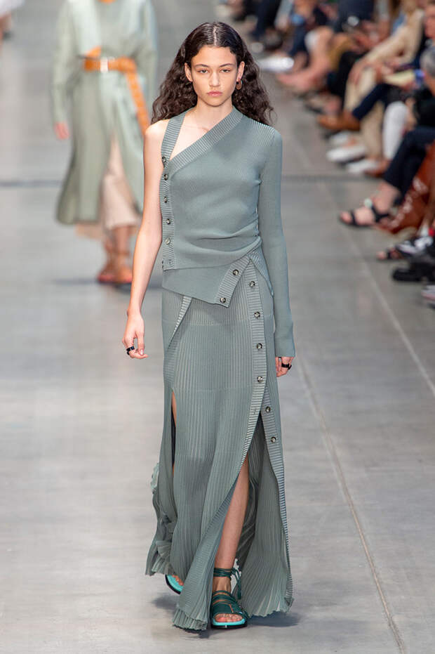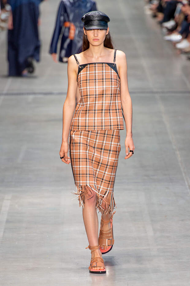 Струящаяся ткань, судя по всему, довольно плотная, выглядела влажной, даже чуть мерцающей от дождя. И через темно-синюю дымку проглядывали очертания девичьего тела и нижнего белья: а ведь именно в этом эффекте и заключается, пожалуй, львиная доля всей романтичности летних дождей.Назвать "дождливой" можно в общем и цветовую гамму коллекции: в ней в основном оттенки синего и сизого, а пудрово-розовый и коричневый выступают с ними на контрасте. Например, когда к тем же летящим свободным платьям неожиданно добавляются детали из кожи — манжеты, воротники и манишки.