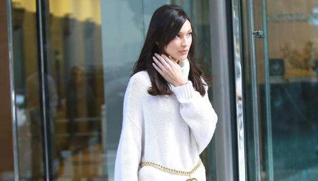 Мы не знаем, платят ли младшей сестре Хадид, как Линде Евангелисте, 10 тысяч долларов за то, что она просто встает с кровати, но собирательный образ супермоделей 90-х девушка часто использует в своих выходах. На примерку в офис Victoria's Secret она вместо платья надела объемный белый свитер с золотым (каким же еще?