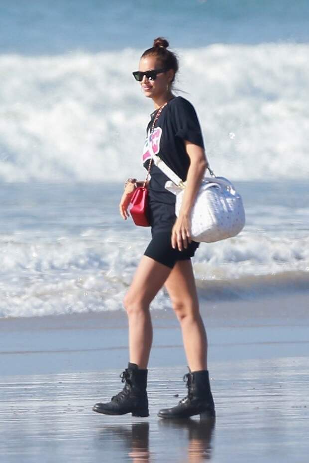 Ирина выбрала для прогулки короткие шорты и свободную черную футболку, а вьетнамкам неожиданно предпочла высокие армейские ботинки на шнуровке. И, как истинная супермодель, захватила с собой алую сумку Chanel для важных мелочей — россиянка знает, что даже на отдыхе обязательно попадет в хроники папарацци.