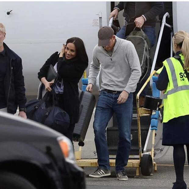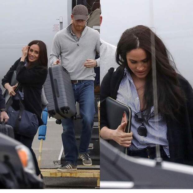 На снимках из аэропорта (пару запечатлели в тот момент, когда их частный самолет приземлился в Ванкувере) Гарри и Меган улыбались и выглядели счастливыми: похоже, что эта красивая молодая пара довольна своим решением. На Меган был наряд, которым больше спровоцировать критику. Герцогиня надела рубашку в полоску бренда своей подруги Misha Nonoo, лодочки Rothy’s, за сто долларов, и взяла с собой в поездку дорожную сумку Prada - но с оговоркой, что это модель Re-Nylon из переработанного океанического мусора.