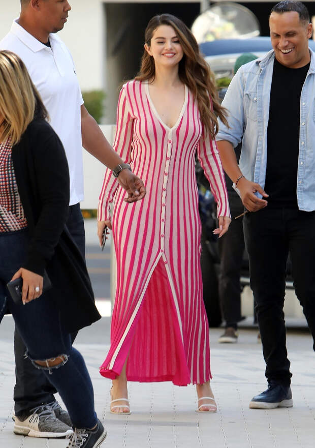 Правда, образ для визита Селена выбрала не самый удачный: Гомес надела трикотажное платье в полоску, которое из-за прилегающего кроя добавило нашей героине несколько лишних килограммов. Впрочем, судя по довольному выражению лица, звездная модница считает свой выход вполне удачным.