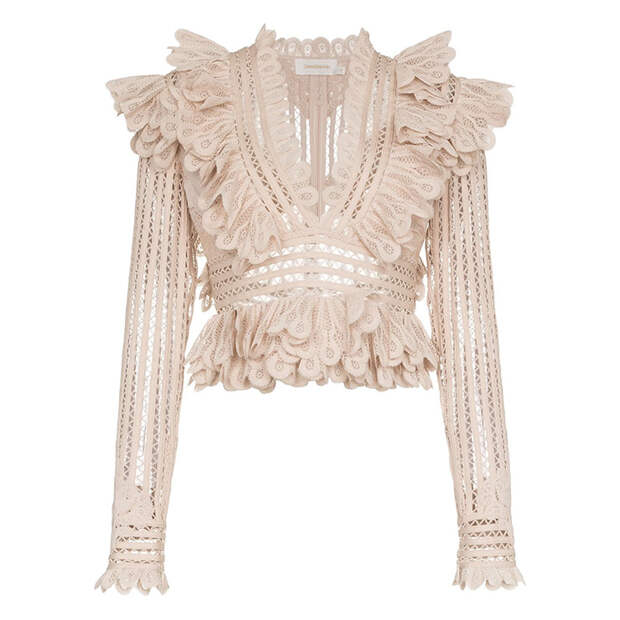 Нарядное и максимально женственное сочетание. Отдавайте предпочтение пастельным оттенкам и простым фасонам, избегайте кричащих акцентов. Но какую-то одну вещь все же можете выбрать “с изюминкой” – например, необычную блузку, такую как у Zimmermann.