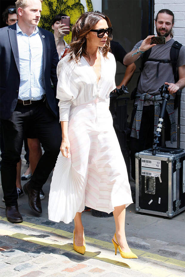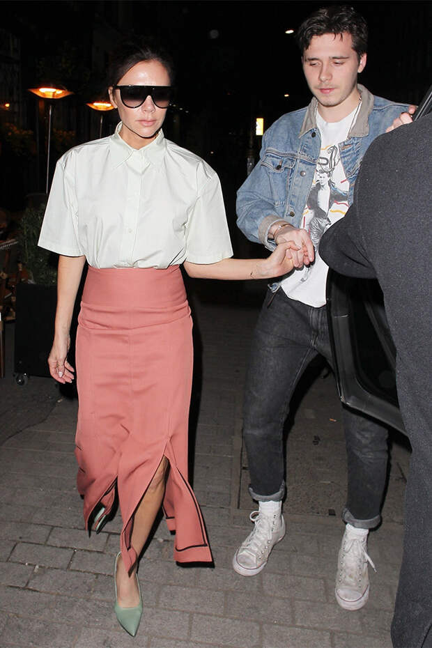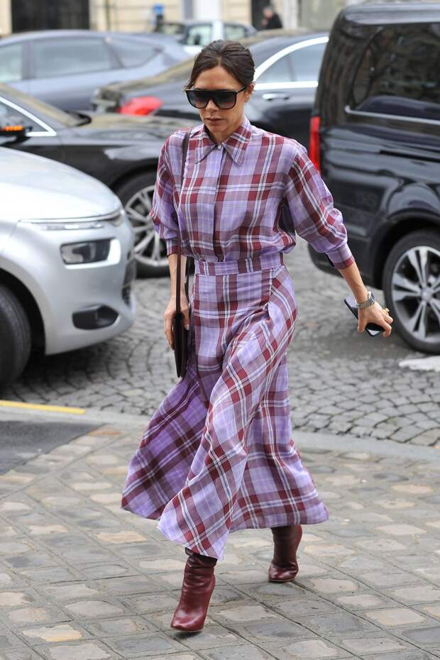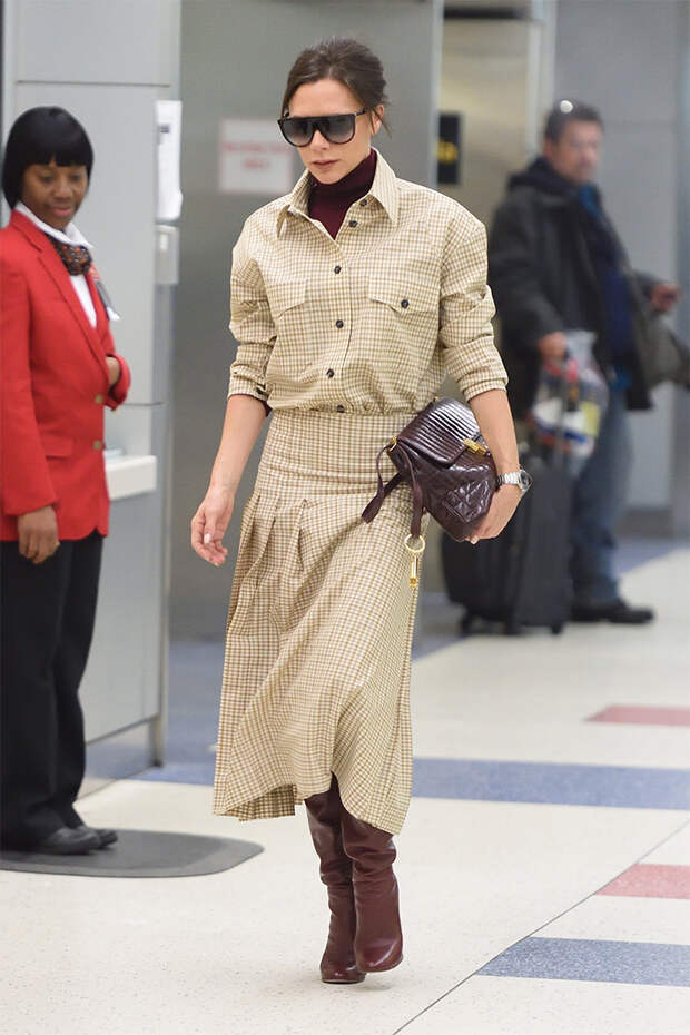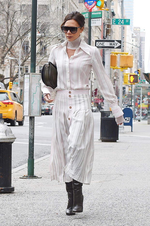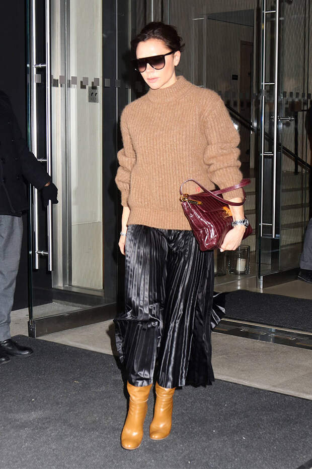 Бекхэм является преданной поклонницей этого сочетания, и именно в юбке миди и сапогах до колена ее можно видеть чаще всего. Тем более что одна универсальная модель обуви (в случае Виктории это черные или бордовые сапоги с каблуком средней длины) подойдет под комплект любого цвета и фасона.