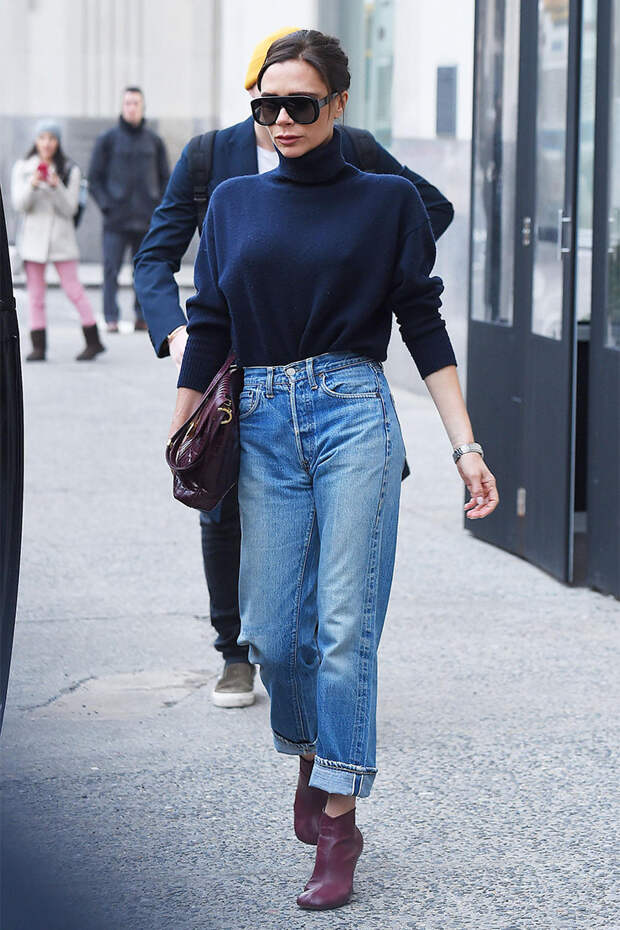 Виктория предпочитает джинсы разных фасонов, но часто ее выбор падает на прямые модели с низкой посадкой. Если это чуть укороченные брюки, то их можно подвернуть и показать красивые туфли на шпильке.