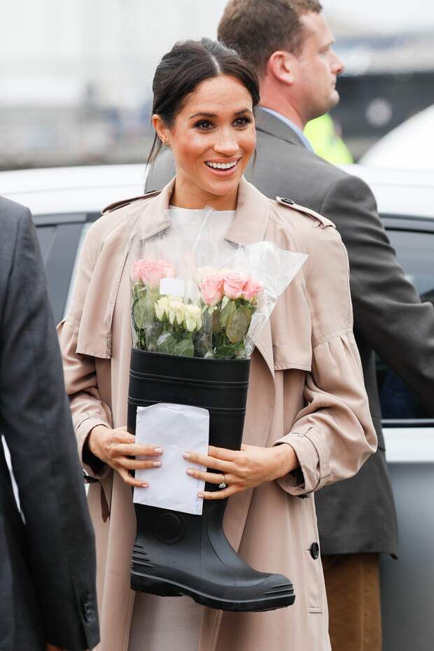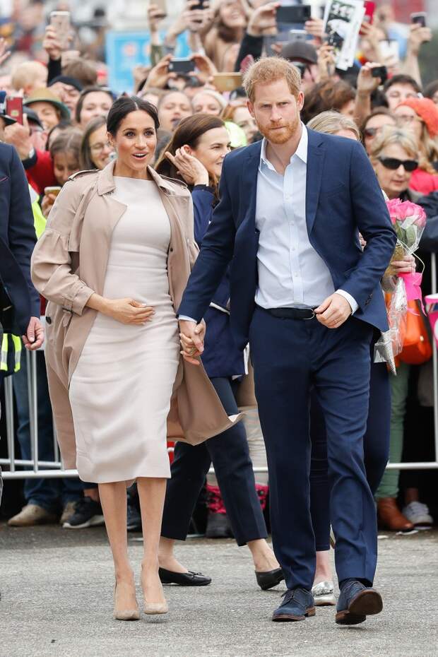 2.Впрочем, разбушевавшаяся природа не смогла повлиять на планы супругов, которые решили лично поприветствовать местных жителей. Меган появилась перед публикой в молочно-белом платье-футляре Brandon Maxwell, шелковом тренче Burberry и бежевых лодочках из замши. Герцогиня трогательно держалась за живот, а принц Гарри всячески ее опекал и следил, чтобы жене было комфортно при общении с большим количеством людей.