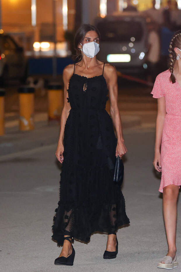 Королева сделала ставку на легкие ткани, прозрачность и летящий силуэт. Подобное макси-платье на бретелях просто обязано быть в вашем гардеробе этим летом, ведь это та самая универсальная вещь, которую можно надеть и днем на прогулку, и вечером в ресторан. Эспадрильи в тон отлично дополнят его, и останется лишь подобрать правильную сумку. Королева Летиция отдала предпочтение лакированному клатчу, и это отличный вариант для вечернего выхода.