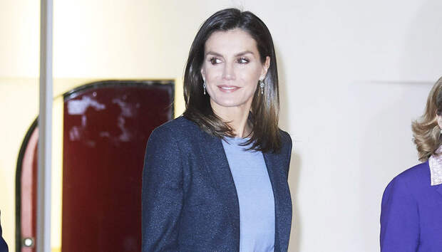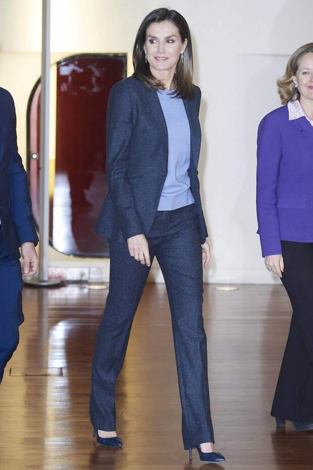 Не только актрисы без ума от брючных костюмов: первые леди тоже отказываются от узких юбок и строгих платьев в пользу ультрапопулярных двоек. Правда, на этот раз супруга Филиппа VI не стала экспериментировать с цветовой палитрой и выбрала спокойный и глубокий серый оттенок — костюм в легкую крапинку Летиция дополнила светло-голубым джемпером Hugo Boss и синими кожаными лодочками от любимого испанского бренда Magrit.