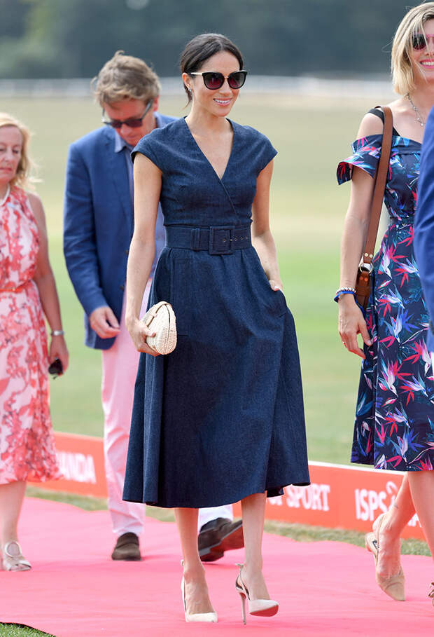 После того, как принц Гарри запретил Меган Маркл носить брючные костюмы, герцогиня усвоила урок – на официальные мероприятия только в платье. Сегодня она неожиданно в компании супруга появилась на благотворительном матче по поло Sentebale Royal Polo Cup. Для выхода она выбрала платье в стиле 60-х с широким ремнем на талии и V-образным вырезом от Carolina Herrera.