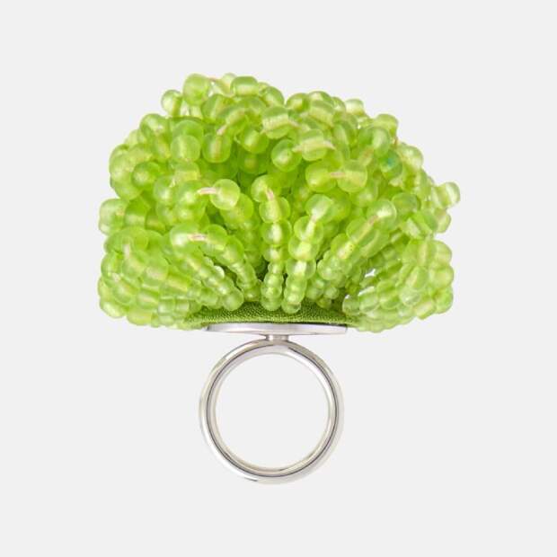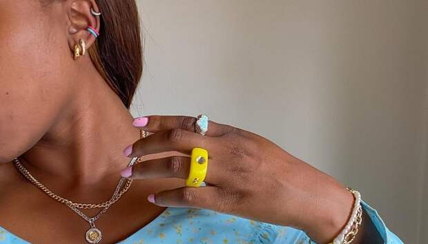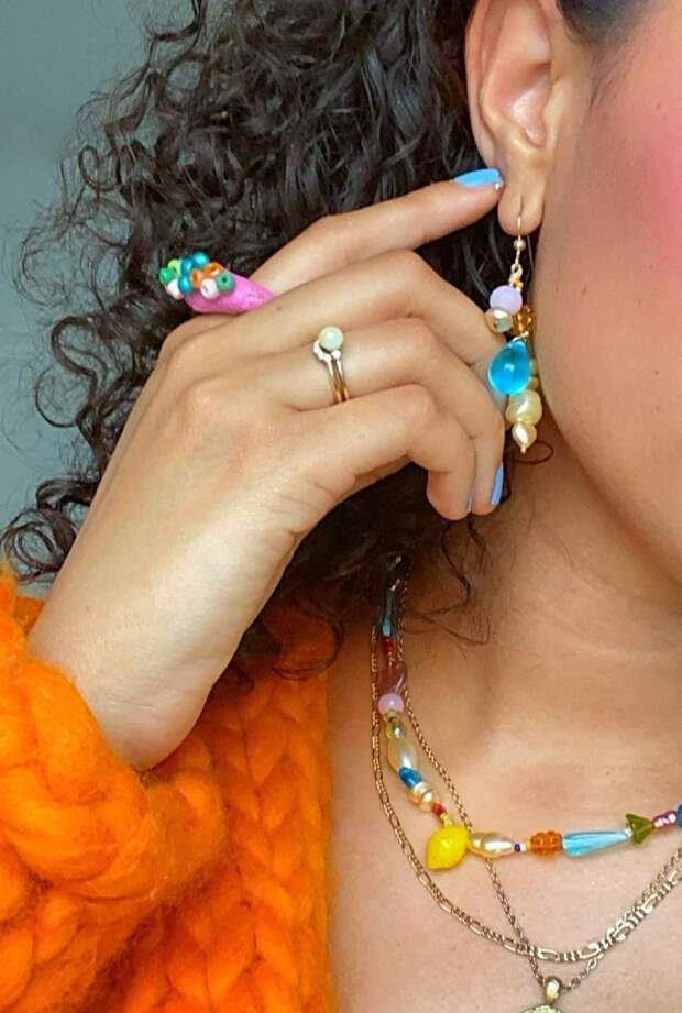 На кольца стоит обратить особое внимание. Их производят из необычных материалов. Помимо пластика, нишевые бренды создают эти изделия из смолы и стекла, как, например, британская марка Goodie Bag. Или из стали и полимерной глины. Так делает испанский бренд By Philomena.