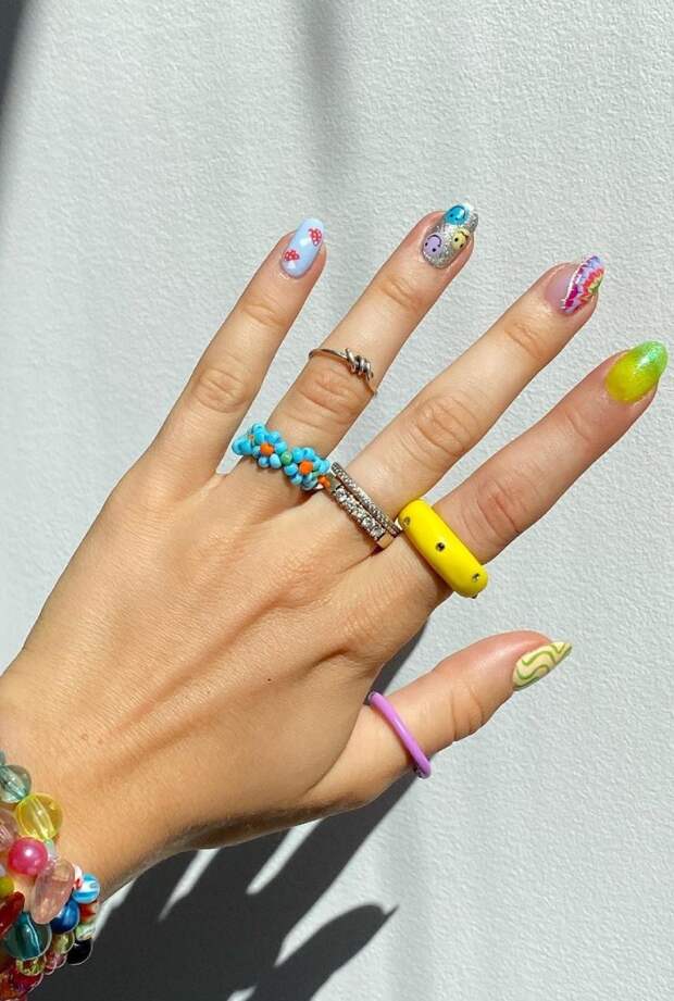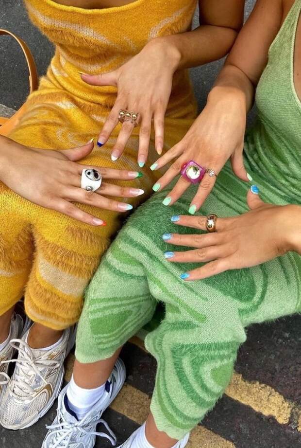 Что касается стилистического применения, то здесь действует принцип «чем больше, тем лучше». Отличным решением будет сочетать сразу несколько больших колец в наивном стиле. Еще одна летняя тенденция — микс «игрушечных» украшений со строгими ювелирными изделиями. Эти причудливые кольца и браслеты также станут идеальным дополнением к пестрому маникюру.