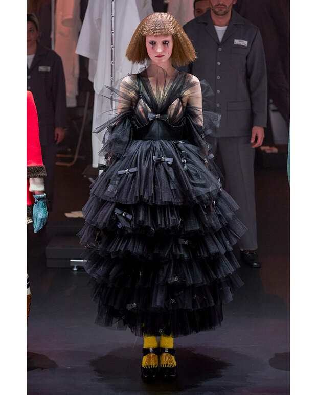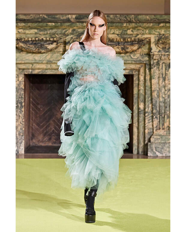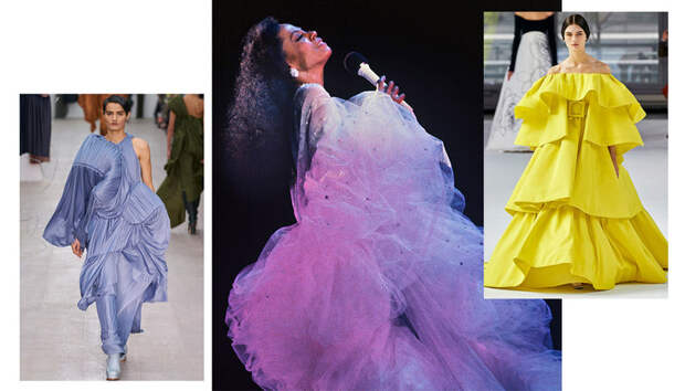 Если в концертный тур с сольным альбомом вас пока не зовут, ничего страшного: Алессандро, Пьерпаоло и другие наши любимцы предлагают носить платья-цветы в любой (ну или почти любой) непонятной ситуации. Чтобы немного «приземлить» образ, меняем тюль на чуть более тяжелые ткани, а гиперобъем создаем за счет асимметрии, оборок и плиссе. Или, наоборот, останавливаемся на классическом сценическом варианте, но дополняем его минималистскими ботильонами на платформе. Макияж в обоих случаях лучше оставить нейтральным или с одним драматическим акцентом – перьями на ресницах, например.