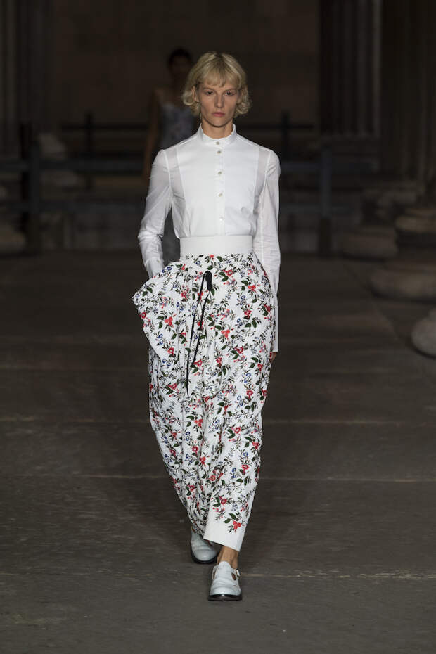 Поэтому в коллекции хватало отсылок ко всем упомянутым эпохам. И, конечно же, традиционных для Erdem элементов и приемов. Нашлось место и для драматичных широкополых шляп, и для утопающих в цветах платьев, и для изысканных вышивок по шелку, и для наивного кроше (в этой технике создан даже жакет!), и для длинных «оперных» перчаток, и для пышных плиссированных юбок. Получилось благородно и, как всегда у дизайнера, в меру драматично — а такой баланс, как мы знаем, не так-то просто выдержать. Впрочем, 15 лет — отличный срок, чтобы приобрести этот редкий навык.