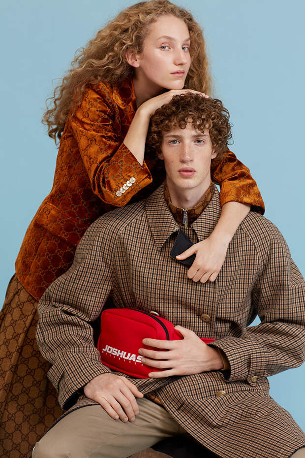 На ней: жакет и юбка Gucci На нем: олимпийка и тренч Gucci, брюки Олово, сумка Joshua Sanders