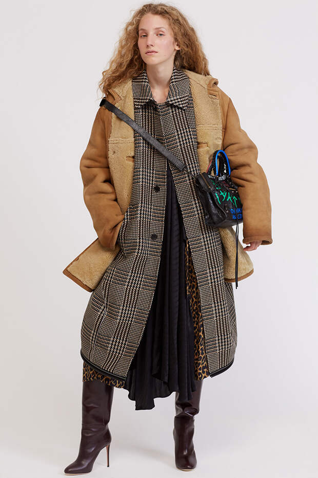 Дубленка Prada, пальто, платье и сумка Balenciaga, сапоги Aquazzura