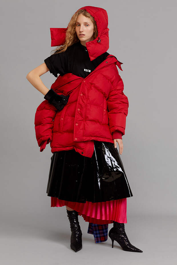 Пуховик и сапоги Balenciaga, платье и футболка MSGM, юбка Mo&Co, перчатки Fendi