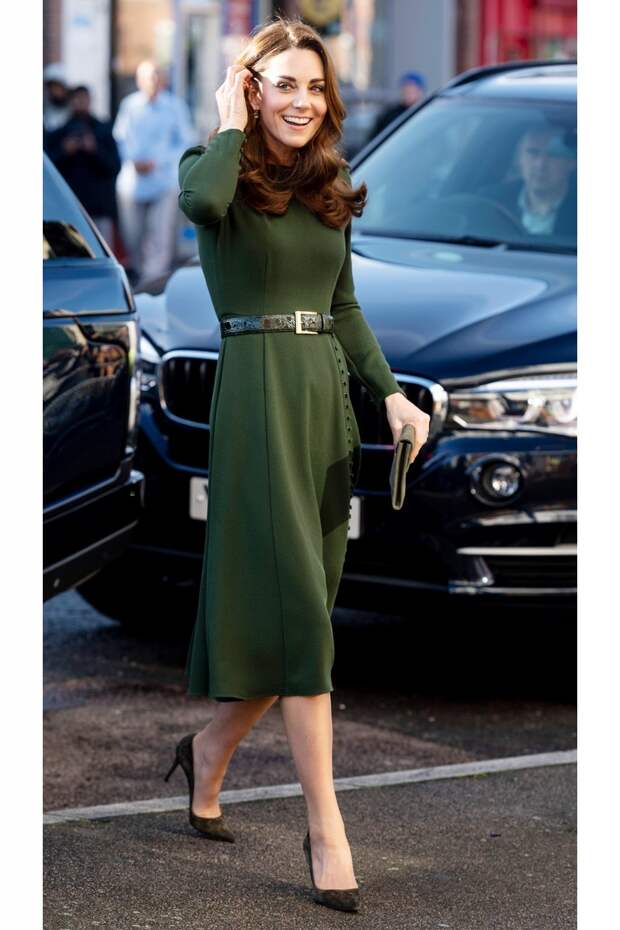 Кейт приехала в лондонский район Луишем в миди-платье в оттенке хаки и выбрала его неспроста: оно было создано брендом Beulah, который поддерживает женщин, переживших насилие. К платью супруга принца Уильяма подобрала широкий ремень из кожи рептилии и замшевые лодочки в тон платью.