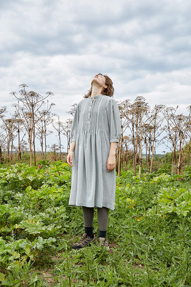 Каждый образ дополняют хлопковые колготки – бежевые или цвета хакки. Их модельер бренда предлагает носить с плотными носками и сандалиями.Такая многослойность – отсылка к русским традиционным костюмам, которыми Пертель вдохновлялась при создании осенне-зимней коллекции. Отсюда же – силуэты, характерные для 19 века, и разные вариации шерсти. Так Оксана переосмысливает историческую моду и пытается подружить вещи “из прошлого” с современным гардеробом.