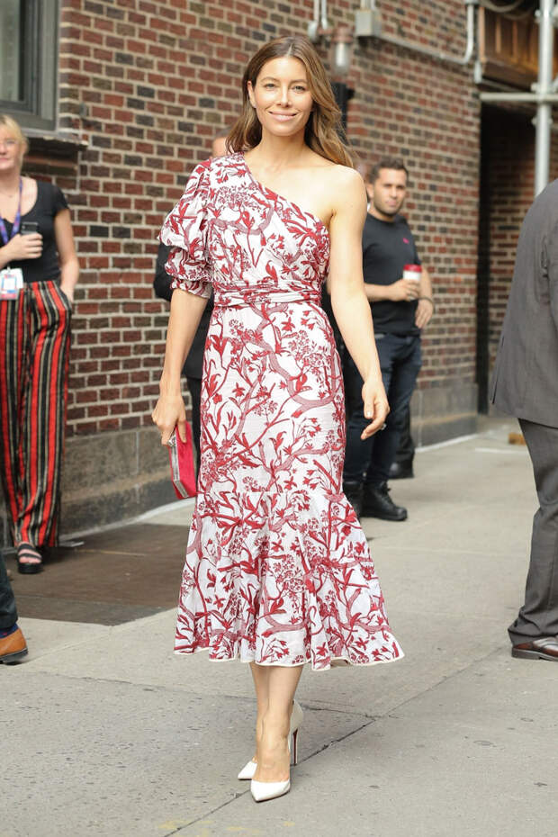 Вчера папарацци заметили Джессику Бил в Нью-Йорке перед входом в театр Ed Sullivan — актриса приехала на съемки шоу The Late Show со Стивеном Кольбером. Джессика выбрала воздушное платье миди Johanna Ortiz с цветочным принтом, лодочки на шпильке и клатч из замши. Макияж сделала минимальный — образ получился очень свежим.