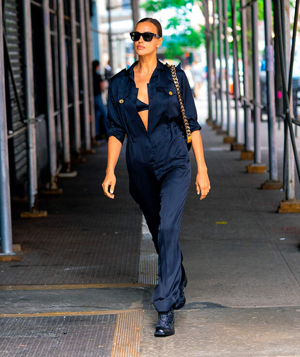 Для летнего дня в мегаполисе российская модель выбрала шелковый черный комбинезон с длинными рукавами и обувь на плоской подошве. Чтобы добавить изюминку в незамысловатый образ, Шейк оставила пуговицы не застегнутыми. Такой прием, демонстрирующий нижнее белье, отнюдь не вульгарный. Во-первых, бра в качестве топа - самый большой тренд этого лета. Во-вторых, Ирина выбрала базовую модель без кружев и лишнего декора, остальные части тела закрыты, а грубые ботинки уравновешивают образ. Но для встречи из школы дочки Леи Шейк все же застегнула комбинезон, чтобы не привлекать лишнее внимание.