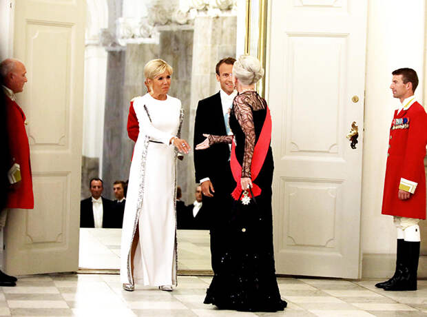 Для встречи с Маргрете II и другими членами королевской семьи 65-летняя супруга президента Франции выбрала очень эффектный наряд: белое платье в пол с длинным рукавом и мерцающими серебристыми полосами по всей длине.