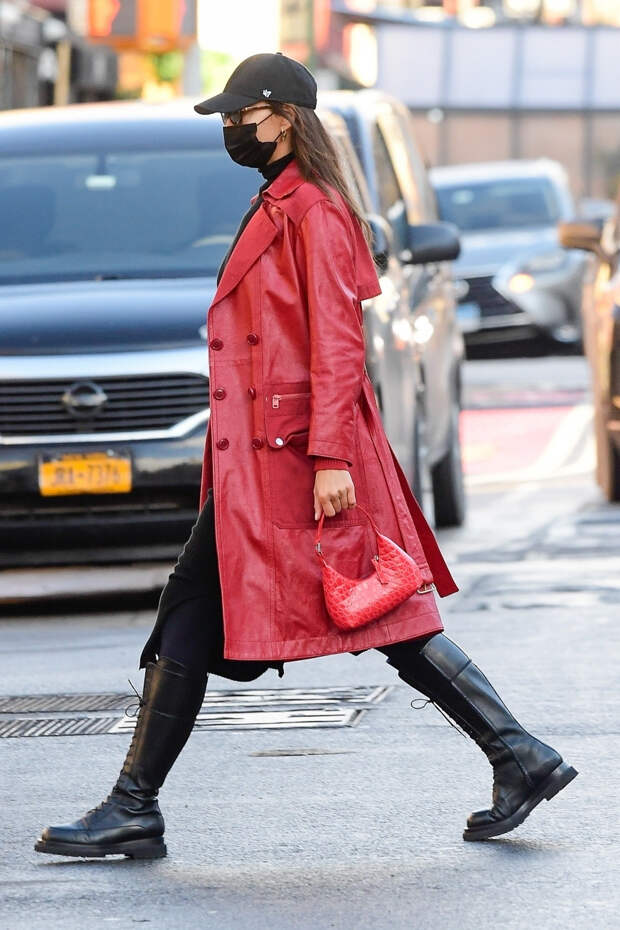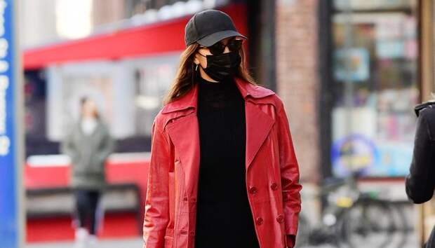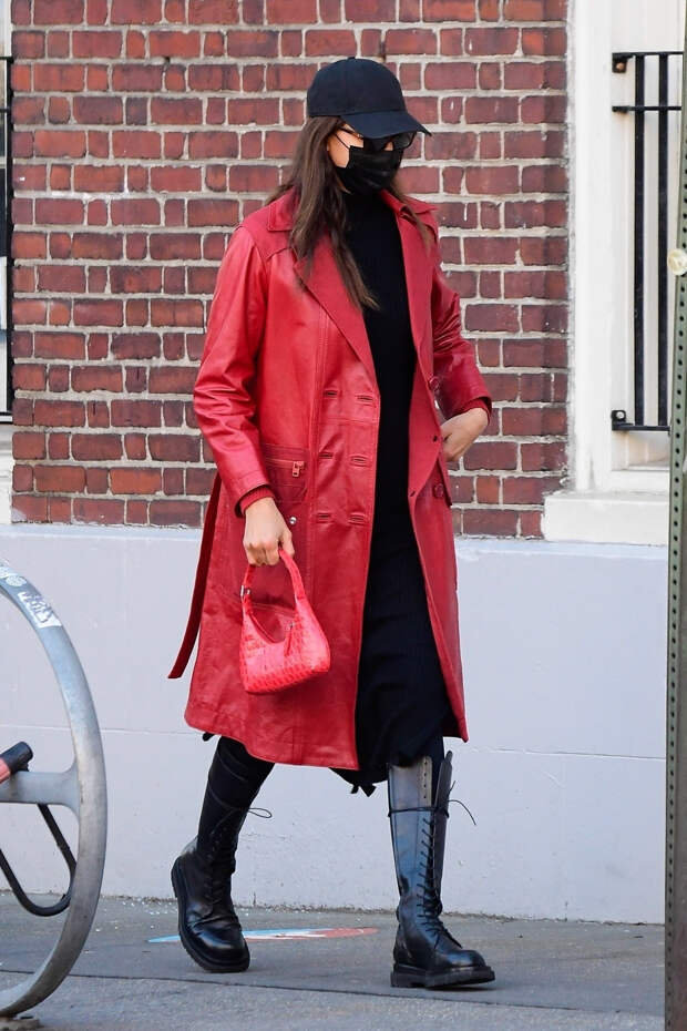 На этот раз нашей героине захотелось разбавить серые будни яркими цветами, и она пошла по самому банальному, но от этого не менее стильному пути - Ирина выбрала кожаный алый плащ, под которым у нее оказалось базовое трикотажное черное платье. Высокие сапоги на шнуровке и плотные черные колготки в тон завершили аутфит модели. Черная бейсболка и миниатюрная красная сумочка из крокодиловой кожи - Ирина выбрала аксессуары в цвет наряда. Еще одним неизменным "аксессуаром" нового времени стала защитная маска: ее Шейк тоже предпочла в черном цвете. Ирине мастерски удается балансировать на грани непринужденности и стиля, оставаясь при этом иконой для многих фэшиониста.