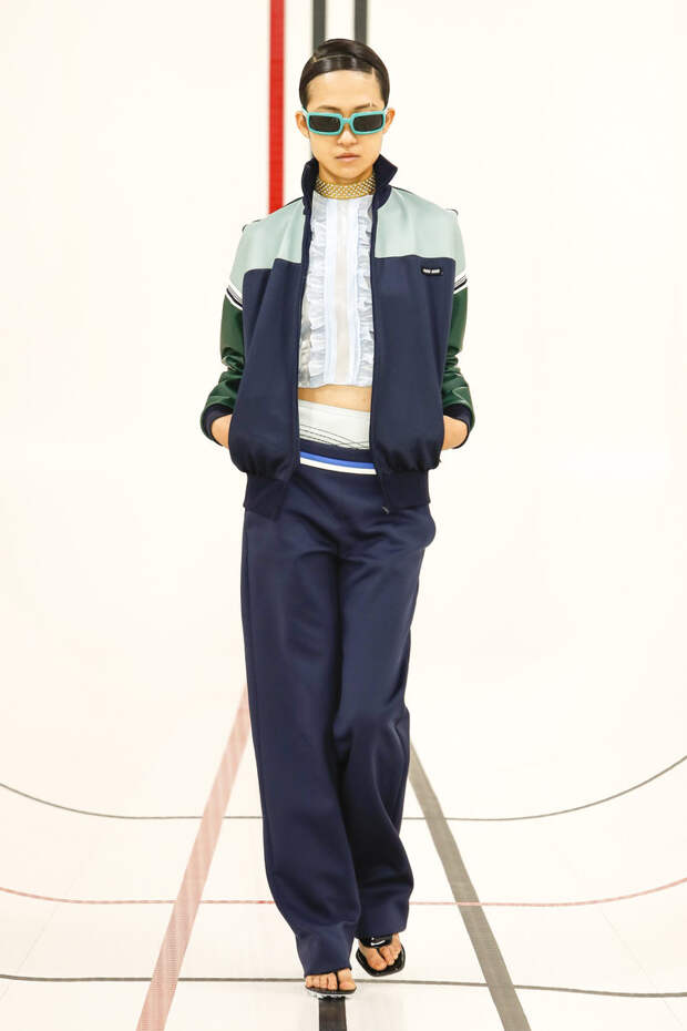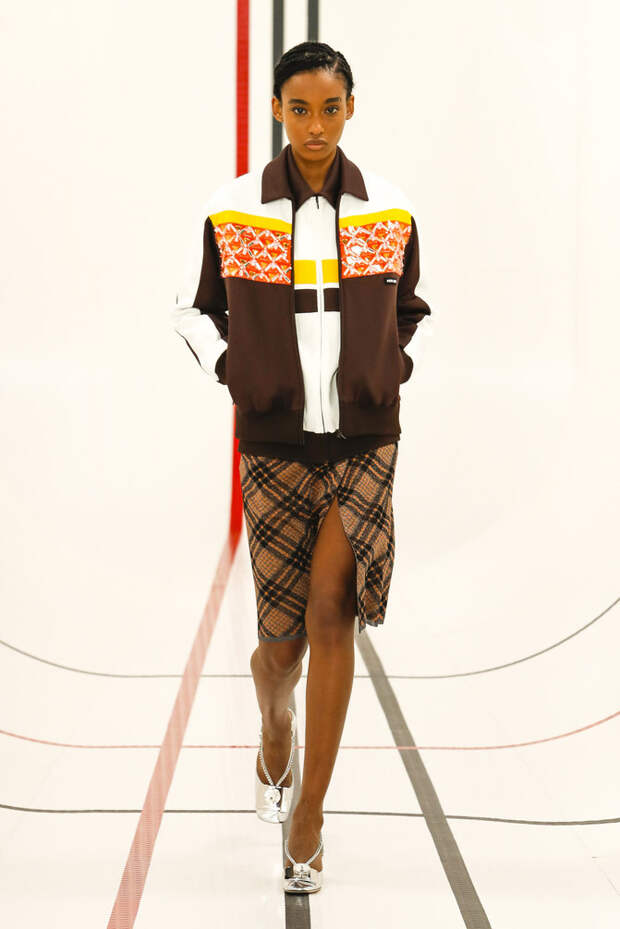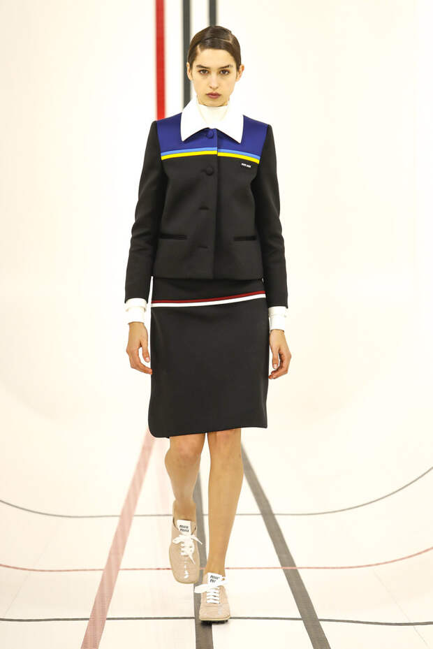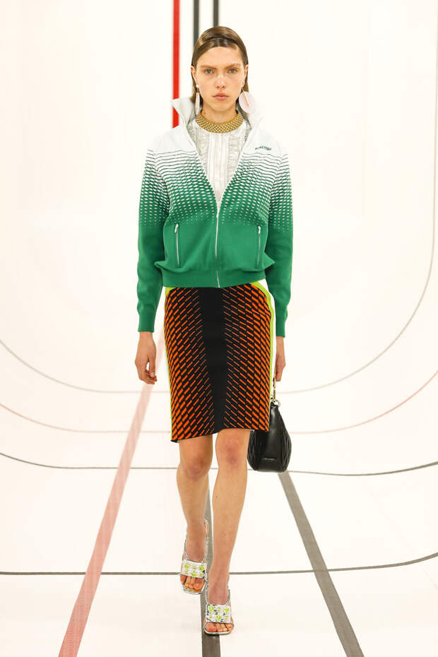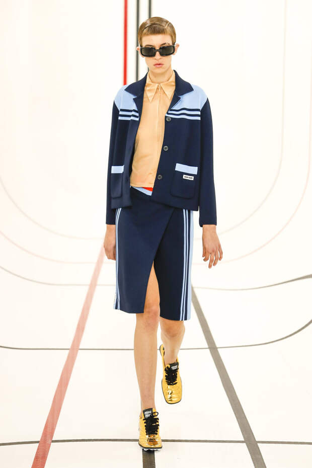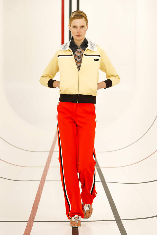 И даже обувь в этот раз абсолютно парадоксальна: где вы еще видели футбольные бутсы на каблуках?Сам показ получил название "Вымышленный дворец спорта". И он буквально проходил в спортивном зале. Но вот как раз у спорта и моды противоречий не так много, как может показаться. Помимо того, что известные дизайнеры часто делают форму для спортсменов (сама Прада тоже не раз этим занималась), обе сферы объединяет одно: они не существуют без наблюдателей. И модный показ, и спортивное соревнование теряют всякий смысл без зрителей. И, по иронии судьбы, именно их они и лишились в результате пандемии. В итоге и те, и другие мероприятия проводятся в пустых залах (еще один оксюморон!). Спасибо современным технологиям за то, что мы можем приобщиться к ним без перемещений в пространстве — прямо из дома. Поэтому показ в абсолютно пустом зале на самом деле видели миллионы людей по всему миру — с экранов своих гаджетов (снова противоречие!). Впрочем, разного рода дихотомии и единства противоположностей — основа подхода Прады к дизайну. Обе ее марки крепко стоят на ее виртуозном умении сочетать несочетаемое. А в нынешних реалиях это еще и самая настоящая новая норма.